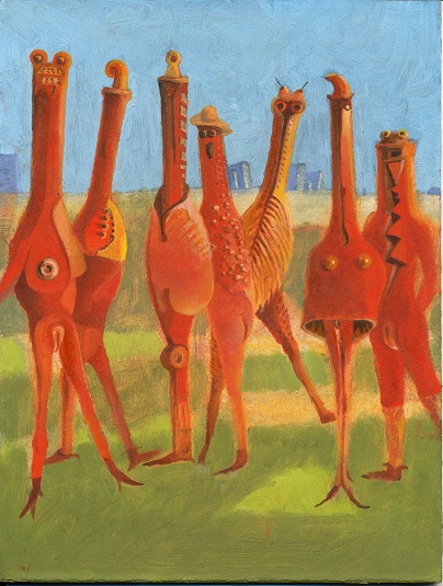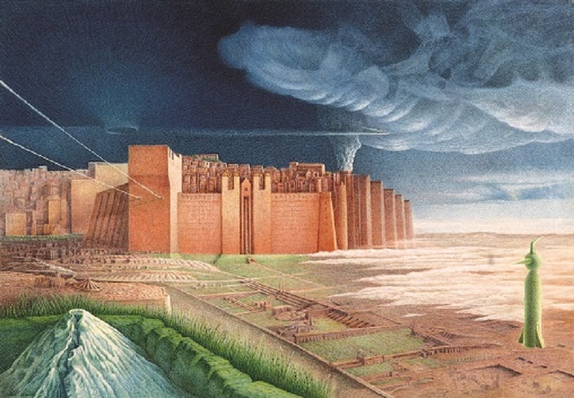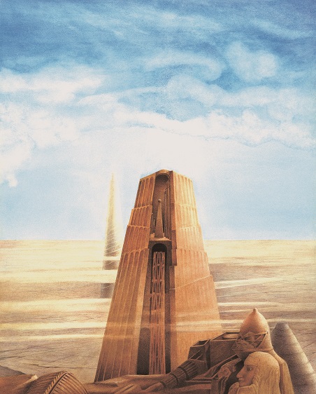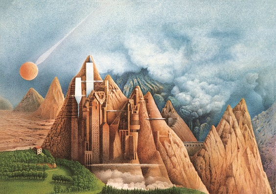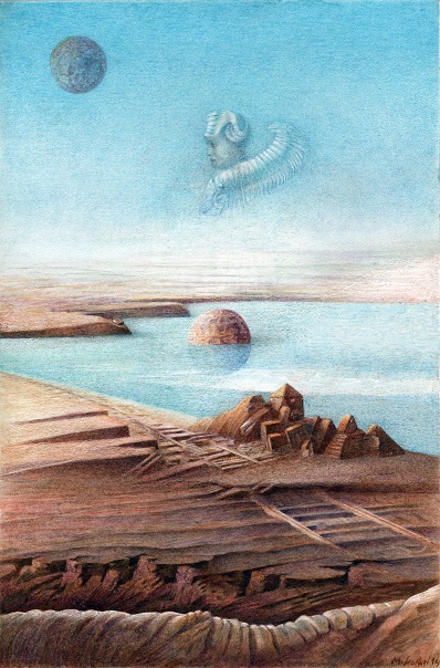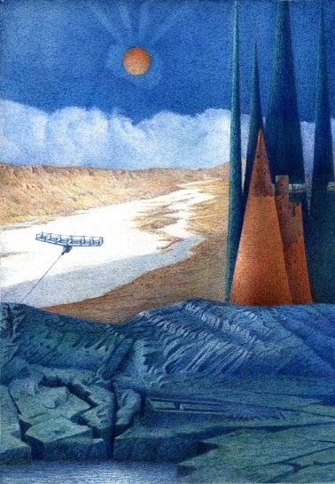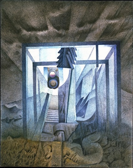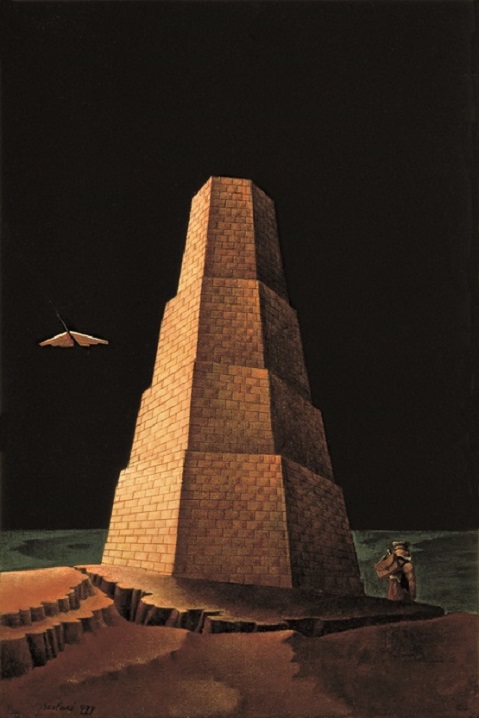 I dipinti di Scolari in esposizione evocano paesaggi metafisici in cui, come scriveva Daniele Del Giudice, “l’oggetto c’è, ma come un dopo silenzioso, l’oggetto come un mito, immagine esemplare, forma autonoma, non certo prodotto inferiore delle attività intellettuali ma imitazione della verità”. Pieni di “attesa”, in una quasi totale assenza di presenze umane, i suoi paesaggi sono abitati da torri, piramidi, ali, fortezze e montagne che compongono visioni immaginarie e paesaggi cosmici.