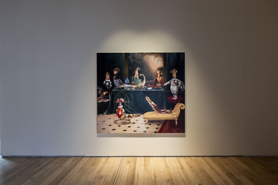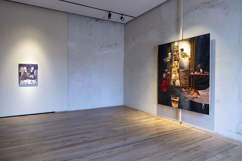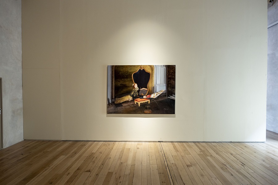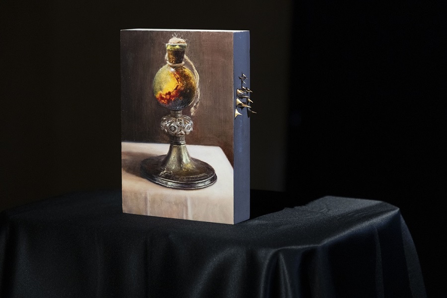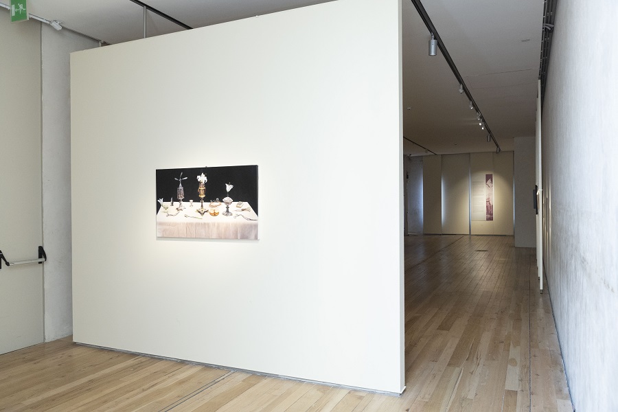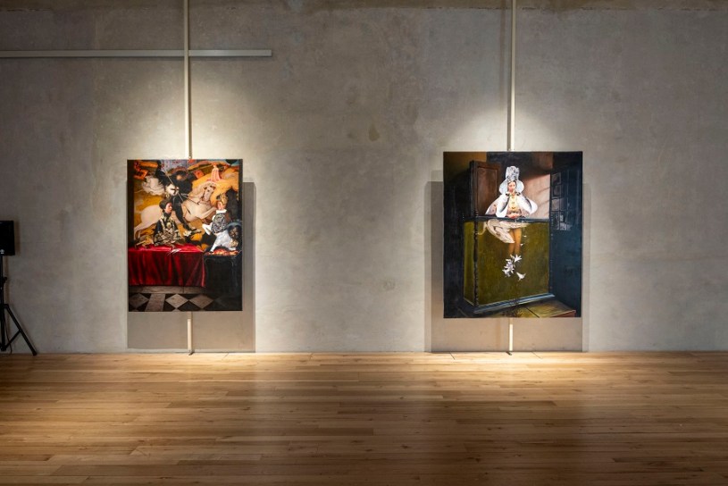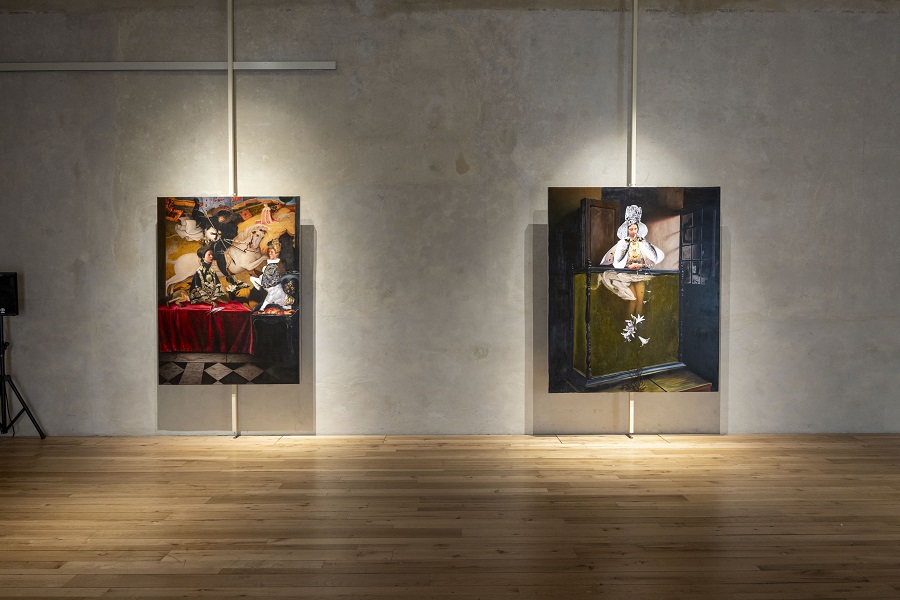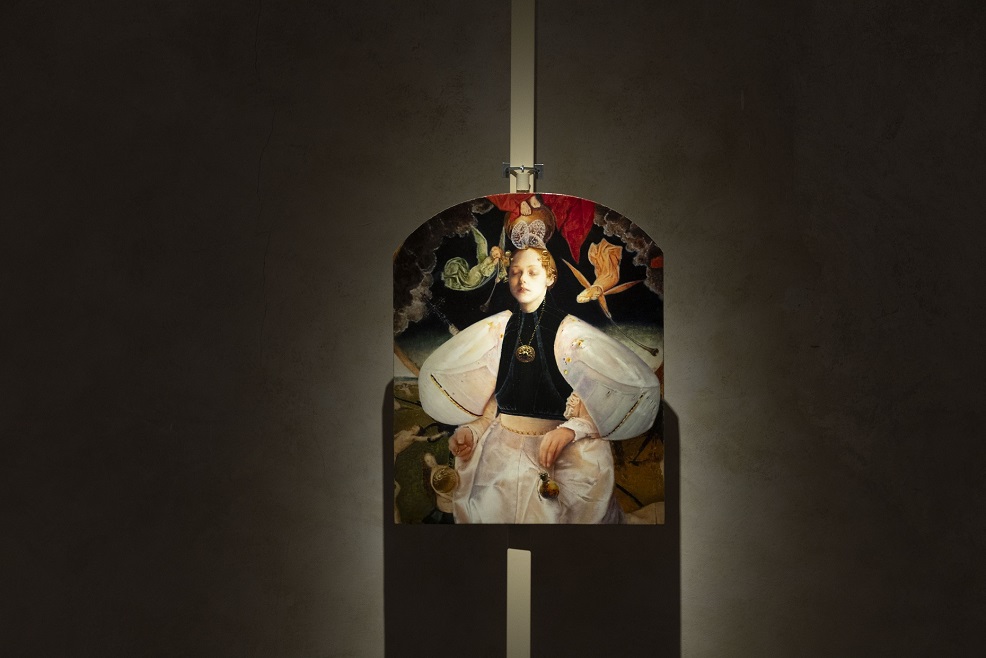 In ascolto di questo luogo – dove l’artista ha trascorso del tempo studiando e ammirandone le meraviglie – nascono le sue tele installazioni, le memorie si intrecciano agli affreschi, ai simboli e agli oggetti liturgici per trasformarli in un linguaggio pittorico visionario. Al centro, il tema della metamorfosi: nascita, dissoluzione, elevazione in cui il corpo diventa luogo fragile e sacro, incubatore dell’anima e strumento di guarigione, mentre tutto è traccia di un passaggio dal terreno al divino. Le nature morte accolgono oggetti un tempo utilizzati all’interno dell’Ospedale, come ciotole e bende, contenitori e strumenti medici, che diventano reliquie laiche e tracce di una cura fisica e spirituale.