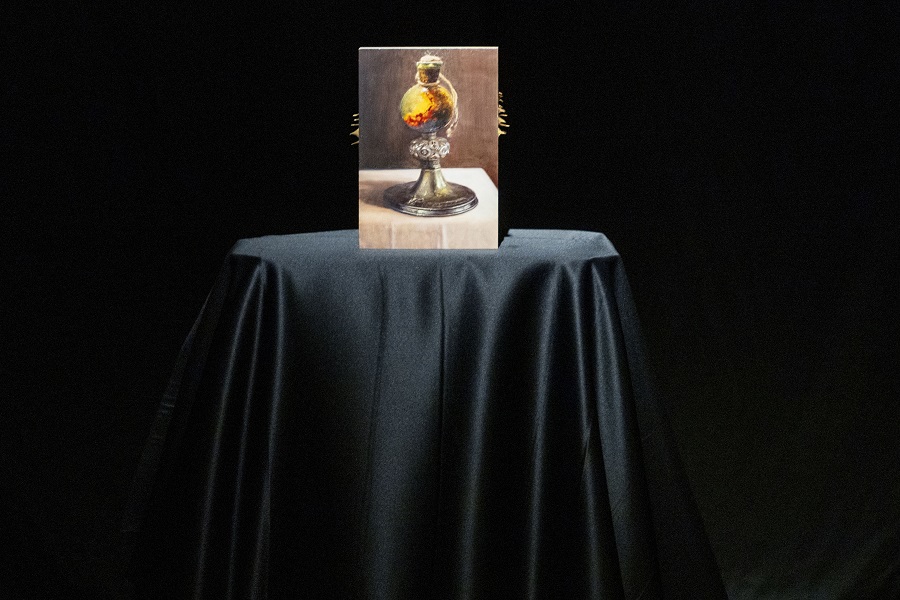 Nell’opera intitolata Still Life with Lilies (2025) una natura morta di reliquie sacre acquistate dall’Imperatrice di Costantinopoli si organizza attorno al Chiodo della Croce di Cristo, trasformato in fulcro luminoso della composizione; in The Ladder (2025) l’artista rielabora gli affreschi del Vecchietta, ricomponendoli in una scala sospesa tra la terra e il cielo; in Restoring the World (2025) una fanciulla angelica custodisce una boccetta col sangue di Cristo, fragile e potente al tempo stesso, come promessa di rinascita.