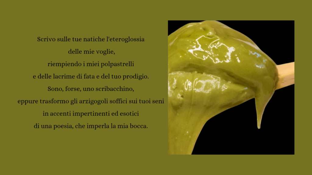 Qui il corpo dell’amato diventa una superficie da plasmare, una tela (evocazioni ricorrenti nella poetica dell’autrice). La crema di pistacchio è la pittura, il desiderio è il pennello.