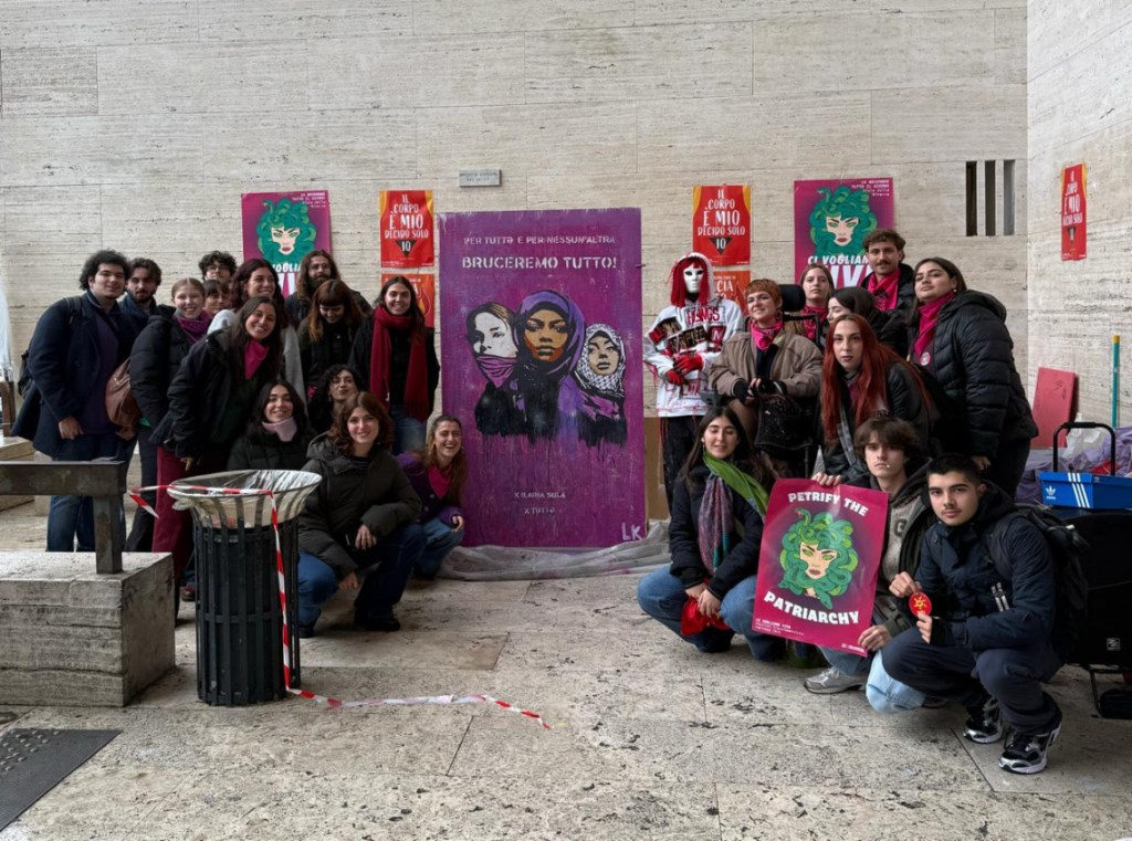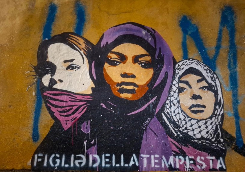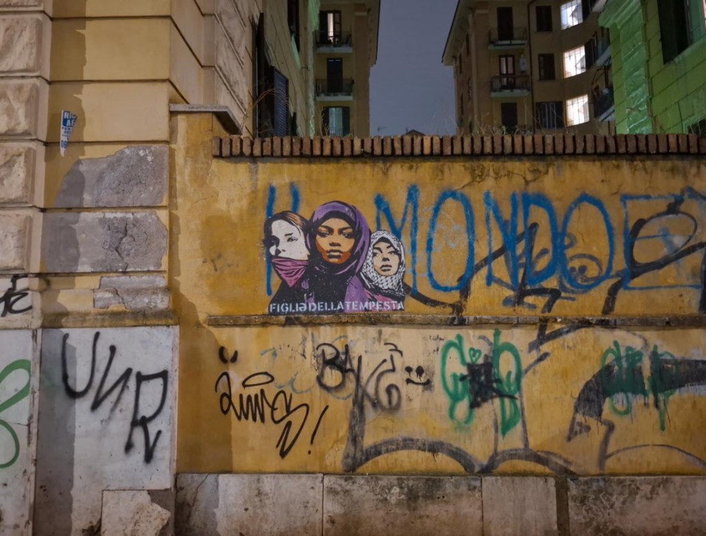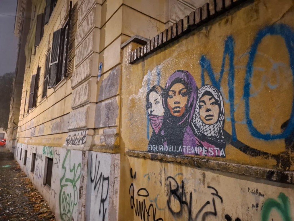 In occasione della Giornata internazionale per l’eliminazione della violenza sulle donne, nella notte tra il 24 e il 25 novembre è comparsa in via Tizii, a pochi passi dall’Università La Sapienza, la nuova opera urbana di Laika, dal titolo “Figliə della Tempesta”. L’intervento, ispirato al brano-inno femminista della Niña del Sud, raffigura tre donne: una sudanese, una palestinese e una europea.