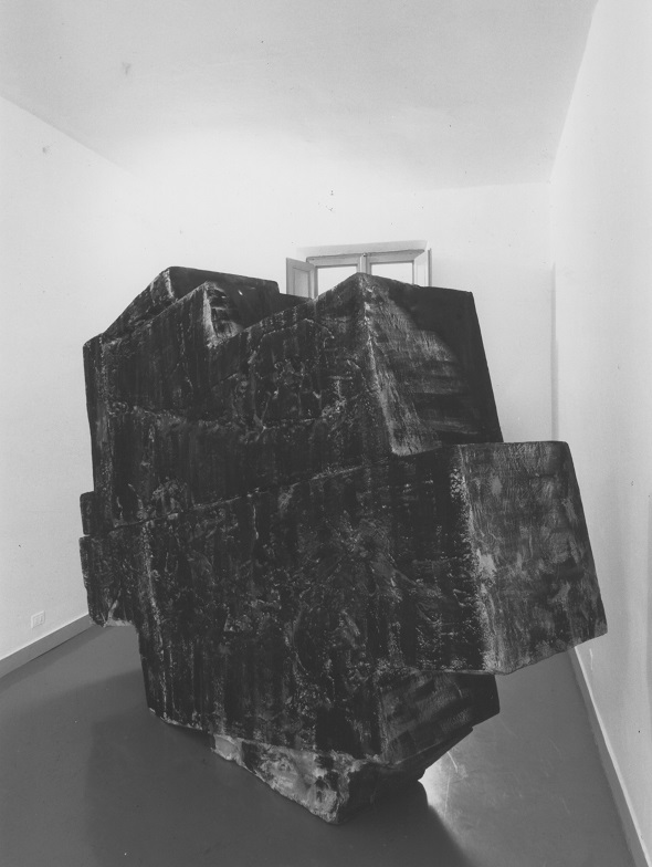 Apre la rassegna La Spalla, una scultura che sembra avere due momenti, un lato prospetticamente levigato, piatto, che evidenzia l’assemblaggio dei blocchi, un altro sbozzato e smussato, tracciando le linee di un’ipotetica forma in formazione. Le altre opere in mostra – in totale cinque sculture e dieci disegni – furono presentate per la prima volta nell’esposizione Arte dello Squallore nella Galleria di Giorgio Persano nel 1985 e nel 1986 proprio nella Galleria Pieroni di Roma e sono costituite da superfici e volumi dai colori scuri e cupi, grandi blocchi di poliuretano.