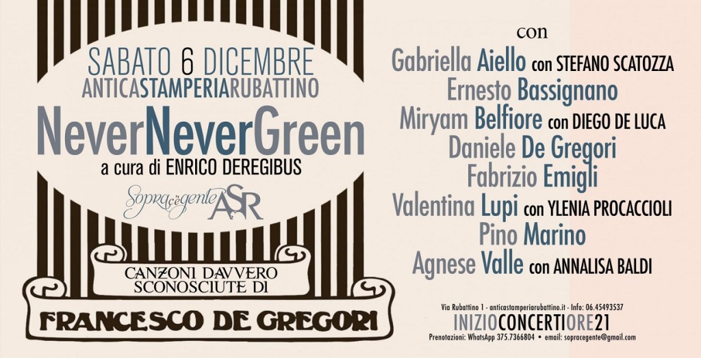 Si terrà il 6 dicembre alle 21 a Roma nel teatrino dell’Antica Stamperia Rubattino e andrà a pescare nel repertorio ancora più nascosto di De Gregori, fitto di brani non meno belli di molti dei suoi successi. Il titolo sarà “Nevernevergreen – Canzoni davvero sconosciute di Francesco De Gregori”.