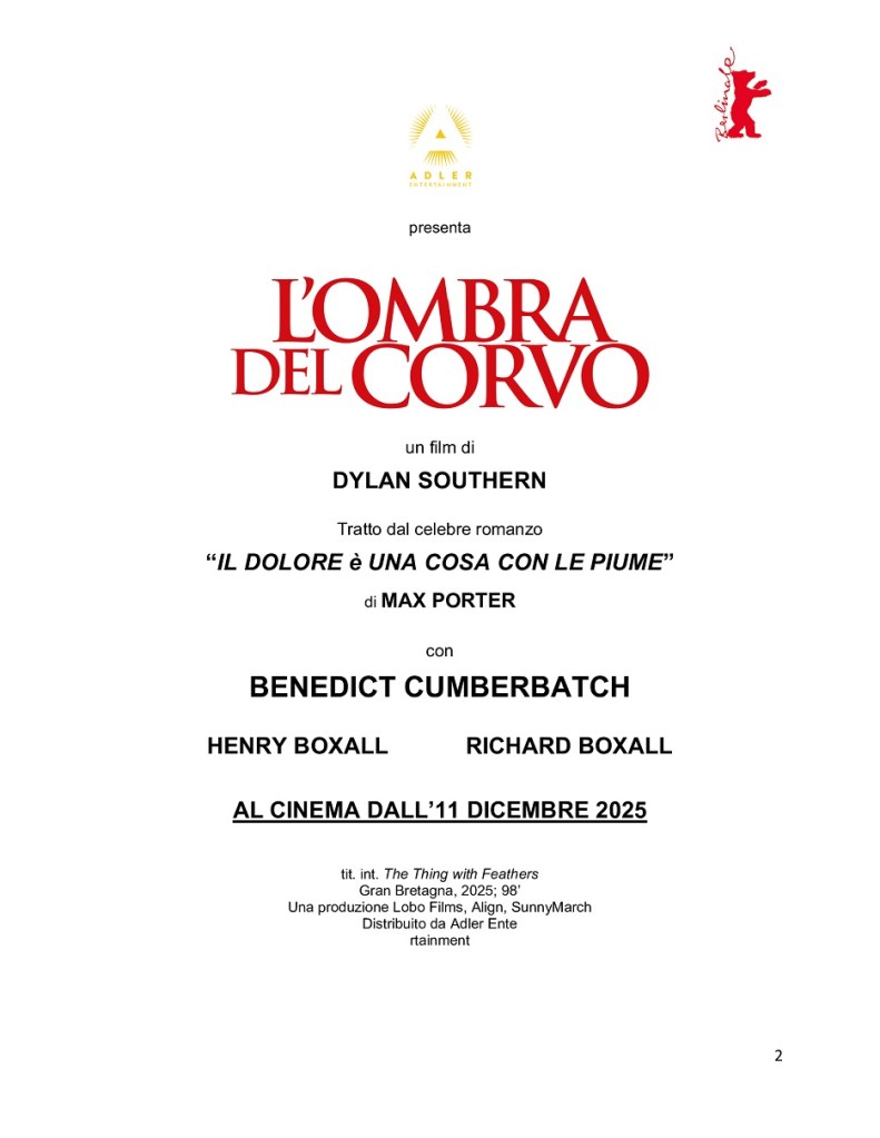 Dopo essere stato presentato in anteprima alla Berlinale, uscirà al cinema l’11 dicembre distribuito da Adler Entertainment “L’Ombra del corvo”, il nuovo film di Dylan Southern con protagonista Benedict Cumberbatch, tratto dal romanzo di Max Porter “Il dolore è una cosa con le piume”.
