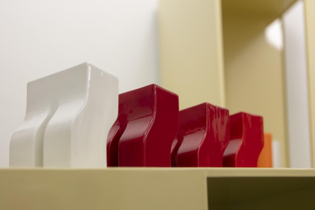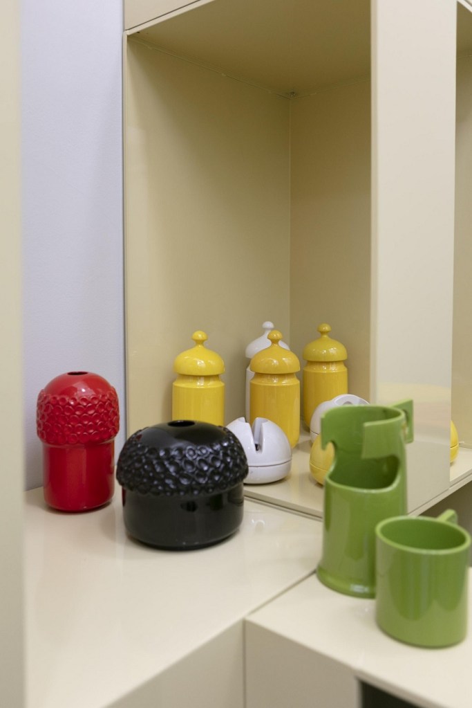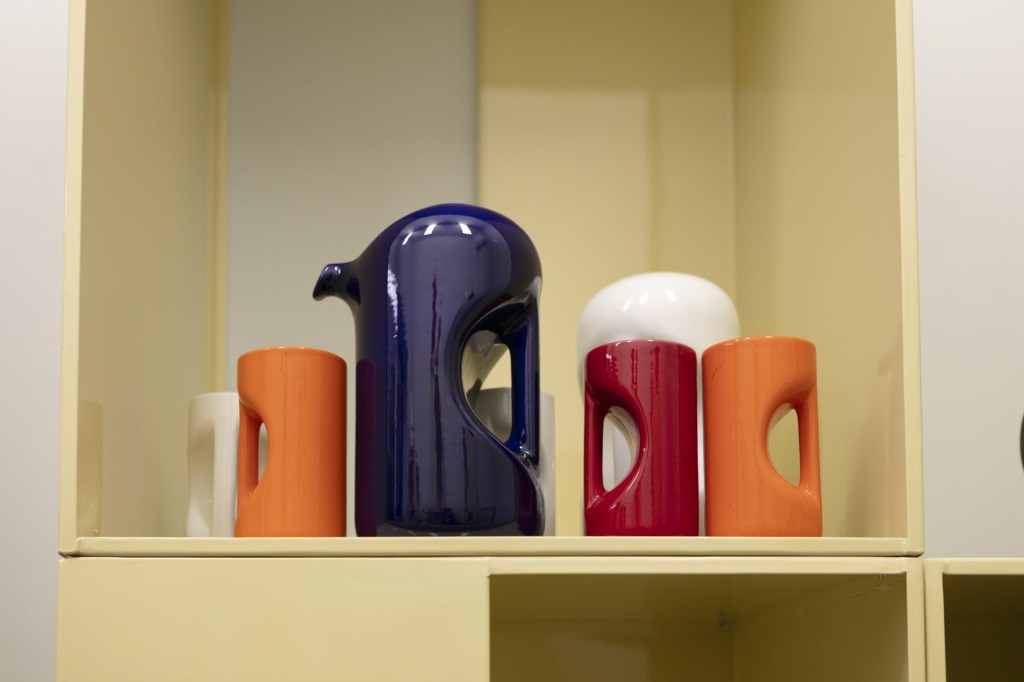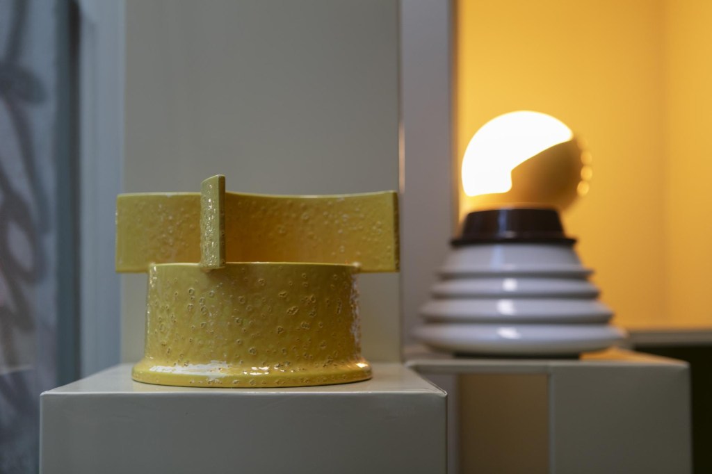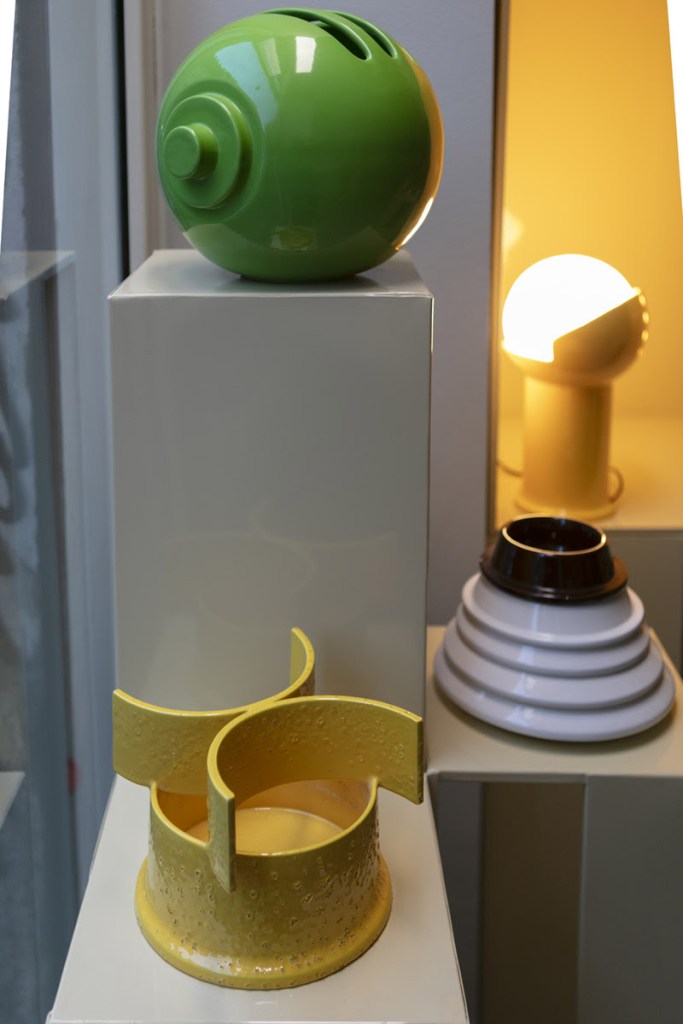 La mostra “IL BATTITO DEL PICCHIO. Il fantastico mondo delle ceramiche di Enzo” dà dunque spazio alla produzione ceramica di Bioli: lampade, fioriere, salvadanai, vasi, portacenere, tazze, piatti, tutti oggetti che rispondono a un linguaggio coerente e riconoscibile, fondato sulla componibilità e sulla modularità, e dunque pensati per dialogare tra loro più che per imporsi come pezzi isolati. Lo stile di Bioli guarda al futuro senza perdere il legame con la quotidianità: le sue forme “space age”, fatte di semisfere lucide, bocche circolari e basi troncoconiche, testimoniano l’interesse per un immaginario internazionale reinterpretato con grande naturalezza nei materiali ceramici. I gres e gli smalti pieni – arancione, blu oltremare, nero lucido – conferiscono agli oggetti una presenza intensa, capace di resistere nel tempo e di adattarsi tanto alla luce di una vetrina quanto all’atmosfera domestica di un salotto.