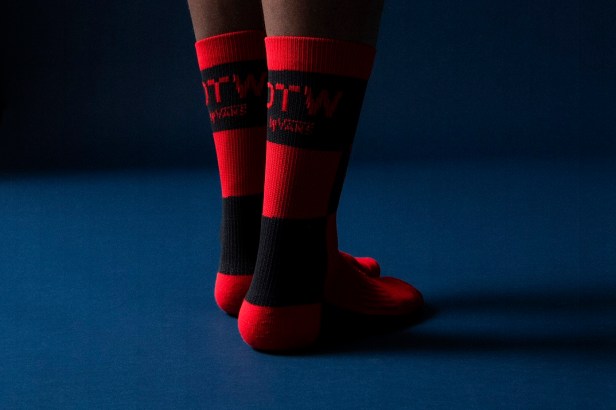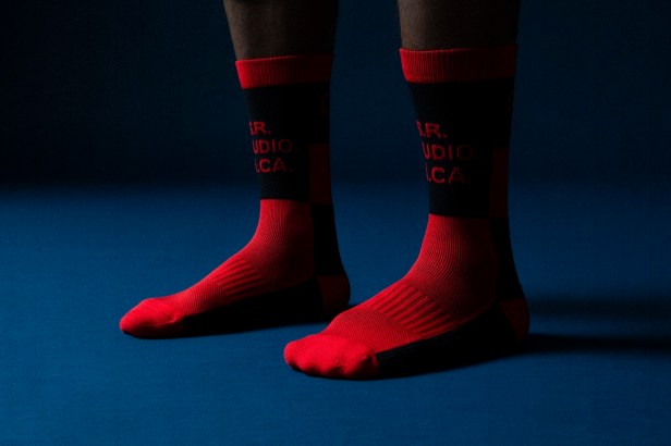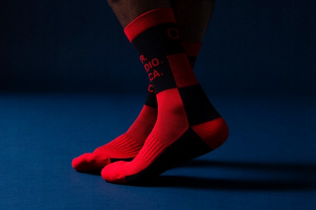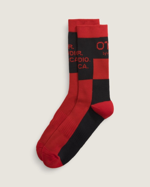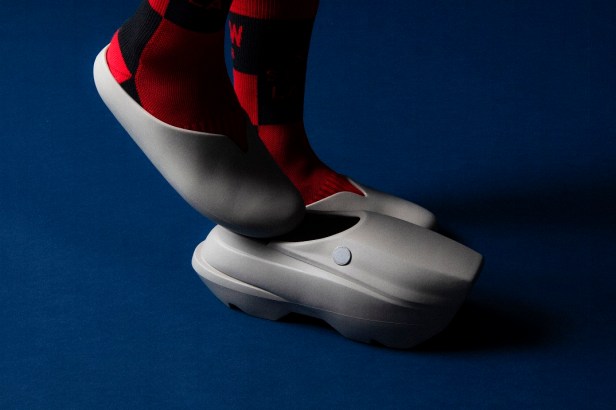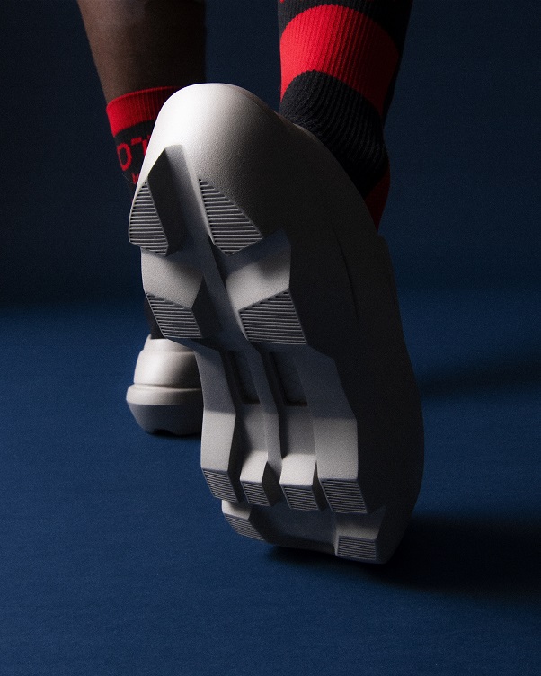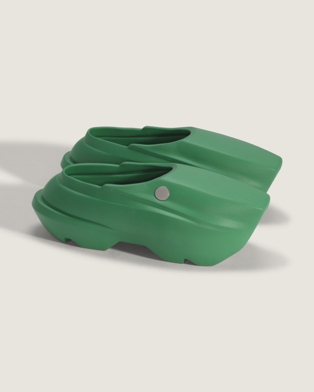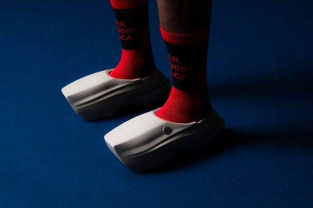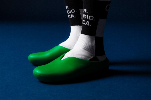 La collezione comprende anche il modello Future Clog in verde, uno stile ibrido che fonde un sabot organico e minimalista con uno zoccolo olandese dal design scultoreo. Completa la collezione un modello di calzini jacquard colorblock rosso e nero.