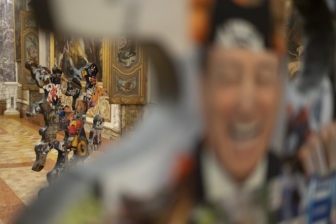 Nel dialogo con le opere storiche della collezione civica di Palazzo Buonaccorsi, la ricerca di Matteo Costanzo costruisce un contrappunto visivo e concettuale: da un lato la compostezza e la solidità architettonica della pittura del passato, dall’altro la mobilità, la frammentazione e la mutevolezza della percezione contemporanea. È un confronto fertile e provocatorio, in cui l’artista interroga la relazione tra memoria e oblio, permanenza e transitorietà, stabilità e caos, invitando il pubblico a riconoscere in questa tensione l’essenza stessa del nostro tempo. Nel suo lavoro, Matteo Costanzo elabora una strategia di riscatto dei rifiuti visivi prodotti dal circuito della comunicazione globale: immagini, slogan, pixel, codici e materiali di scarto che l’artista riutilizza con spirito costruttivo, offrendo loro una seconda possibilità nel campo della creazione artistica. In questa operazione, l’atto del “riuso” diventa gesto poetico e politico insieme, un modo per trasformare il rumore dell’informazione in linguaggio, la dispersione in visione, l’eccesso in significato.