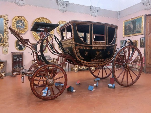 Opere esposte Sergia Avveduti - Berlina, 2025 – Carta - Dimensioni ambientali Sotto la grande carrozza del Settecento sono visibili, distanziati tra loro, vari gruppi composti da due o tre libri. Questi piccoli assembramenti costituiscono strutture astratte, minimaliste e ortogonali che si confrontano con la forma e la decorazione del mezzo di trasporto. La carrozza è ornata di intagli dorati e sulle pareti sono dipinte le quattro Virtù Cardinali: Giustizia, Fortezza, Prudenza e Temperanza. La tensione verso il sapere idealmente suggerita dai libri si coniuga con le virtù dipinte. Sergia Avveduti - Verso l'occidente, 2025 - Stampa lambda su carta fotografica Fuji su dibond, cm 50 x 42 (Jean-Baptiste-Siméon Chardin da La casa di carte,1737-1740, Londra, National Gallery) - Stampa lambda su carta fotografica Fuji su dibond, cm 38 x 42 (Jean-Baptiste-Siméon Chardin da La casa di carte, 1735 Parigi, Musée du Louvre) Sulla parete che ospita il dipinto di Giuseppe Maria Crespi intitolato Giocatori di dadi l'artista ha collocato due stampe digitali di altrettanti dipinti di Chardin sullo stesso tema e che per osmosi si connettono idealmente al quadro esposto. Anche in questo caso l'artista, come per Orazione nell'orto (2025), ha rimosso tutti i personaggi ricostruendo lo sfondo. In questo modo si delinea uno spazio vuoto, astratto. L’ambiente appare così arredato da piccoli elementi che prima erano in secondo piano, e che ora costituiscono un sottoinsieme emotivo. Sergia Avveduti - Pizzicato, 2025 - Stampa sublimatica su twill, cm 45 x 60 cad. Due paesaggi stampati su tessuto sono liberamente assicurati a un antico leggio bifronte presente in una sala del museo. Sergia Avveduti - Il castello di carte, 2025 - Stampa sublimatica su twill, cartoncino cm 35 x 42 x 26 / cm 35 x 40 x 23 Tre coppie di pannelli disposte obliquamente a suggerire un castello di carte, sono ricoperti da immagini tratte da dipinti e affreschi antichi. Le immagini sono rielaborazioni e modificazioni di affreschi e dipinti di Tiepolo e Canova. La modifica operata in digitale pone in risalto architetture e prospettive naturali, escludendo le figure umane che vengono rimosse. Il risultato è una successione di scenari silenziosi, astratti, in spazi indefiniti e misteriosi. Si tratta, nel complesso, di una riscrittura che restituisce una sensibilità squisitamente pittorica e “ricca”, ottenuta senza l’utilizzo dei pennelli. Si ha la sensazione di immergersi in un tempo sospeso, di assistere a un riferimento alla storia dell’arte, una eco dell'antico. Il castello di carte poi diventa nella sua regolarità un elemento minimalista e astratto. Sergia Avveduti - Orazione nell'orto, 2025 - Stampa lambda su carta fotografica Fuji su dibond, cm 21 x 27 (Prospero Fontana da Orazione nell'orto, 1565/1570, Bologna, Museo Civico d’Arte Industriale e Galleria Davia Bargellini) Il dipinto di Prospero Fontana non è al momento visibile perché in prestito temporaneo per la mostra Bartolomeo Cesi (1556-1629). Pittura del silenzio nell’età dei Carracci, in corso al Museo Civico Medievale di Bologna fino al 22 febbraio 2026. Al suo posto l'artista ha collocato una copia fotografica sulla quale è intervenuta apportando alcune modifiche: il protagonista e gli altri personaggi sono stati rimossi in modo da ampliare il paesaggio sullo sfondo. Sergia Avveduti - Anni tra i secondi, 2025 - Object trouvé, cera, cm 7 x 10 x 29 / cm 8 x 13 x 32 Due sculture in cera raffigurano il gesto di mani alzate che stringono forbici aperte, le dita risultano impegnate in movimenti complessi. Il riferimento è al lavoro costante e accurato svolto anticamente dalle ragazze del Conservatorio di Santa Marta. Sergia Avveduti - Il pensiero nell'ombra, 2025 - Object trouvé, cera, cm 6 x 14 x 15 Uno spegni candela in metallo è la base d'appoggio per una piccola scultura in cera che ritrae una mano, e, come in un Giano bifronte, presenta sull'altro lato in continuità una testa di lupo. Sergia Avveduti - Eggcup, 1999 - PVC su legno, uovo, cm 50 (a) x 88 (diam.) Sorretto da una base astratta curvilinea, un plastico di grandi dimensioni riproduce una città fortificata e allo stesso tempo svolge la funzione di portauovo. Il particolare alloggiamento funzionale è posto sulla sommità di una torre. Sergia Avveduti - Polpa e nocciolo, 2006 - Ceramica smaltata, legno, cm 58 (a) x 70 (diam.) L'iconografia di un dado medievale è riproposto in ceramica e fuori scala. Questa insolita geometria associata all'oggetto d'uso (che ha a che fare con l'alea, la casualità e indirettamente anche con la buona e la cattiva sorte) riduce l'intarsio ligneo sul dado a una sola e unica possibilità di punteggio. Sergia Avveduti - Tifone, 2021 - Stampa su zinco, acciaio, legno, cm 133 x 80 x 81 La scultura propone la rivisitazione della forma di un tavolino modellato assecondando la dimensione del curvilineo e dell’organico. Sulla sua sommità, in forte contrasto, è presente una stampa fronte retro su zinco: si tratta dell'immagine di una costellazione lontana. Il soggetto è da porre in relazione con la forma del tavolino la cui base è in realtà un meccanismo di orologio ingrandito e montato su tre gambe.