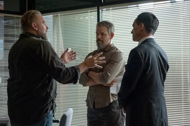 THE RIP – BTS – (L to R) Steven Yeun as Detective Mike Ro, Matt Damon as Lieutenant Dane Dumars and Writer/Director Joe Carnahan on the set of The Rip. Cr. Warrick Page/Netflix © 2025.