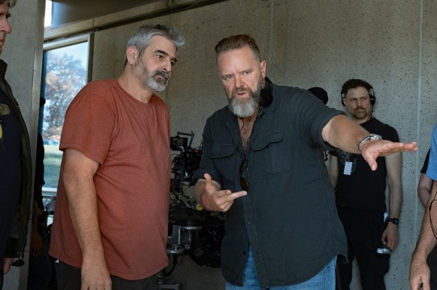 THE RIP. (L to R) Kyle Chandler as DEA Agent Mateo ‘Matty’ Nix and Writer/Director Joe Carnahan on the set of The Rip.Cr. Claire Folger/Netflix © 2025.
