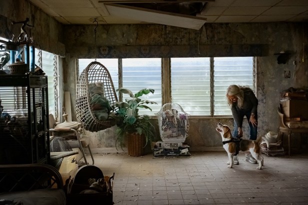 THE RIP. Wilbur The Dog as Wilbur The Money Dog and his trainer Nancy Novograd on the set of The Rip. Cr. Claire Folger/Netflix © 2025.