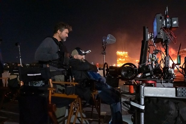 THE RIP. (L to R) Cinematographer Juanmi Azpiroz and Writer/Director Joe Carnahan with crew members on the set of The Rip.Cr. Claire Folger/Netflix © 2025.