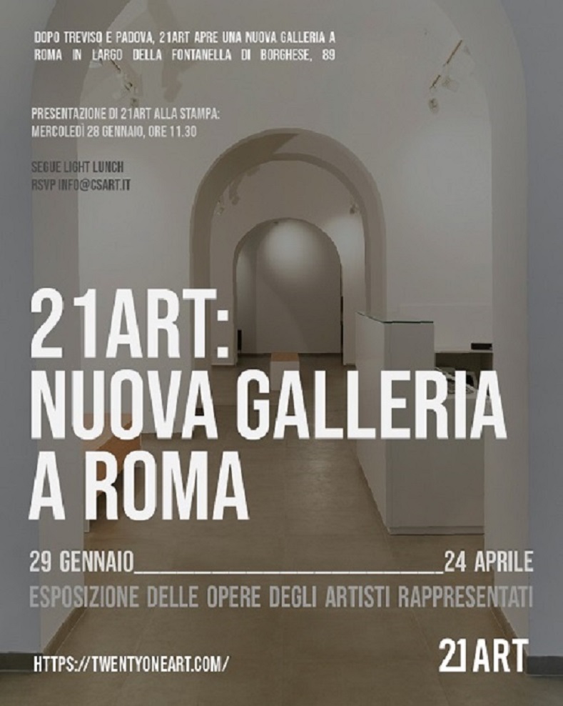 21Art Roma sarà accessibile al pubblico dal 29 gennaio 2026 con una selezione di opere di giovani promesse e artisti internazionali cui saranno dedicate, nel corso del 2026, mostre personali e momenti di approfondimento nelle diverse sedi di 21Art, tra cui quella romana.