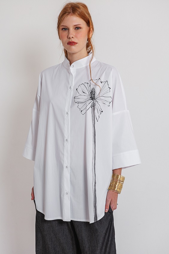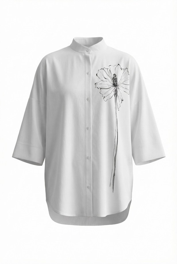 I petali ampi e il pistillo allungato si sviluppano verticalmente lungo la camicia, slanciando la figura e creando un equilibrio raffinato tra illustrazione e minimalismo.