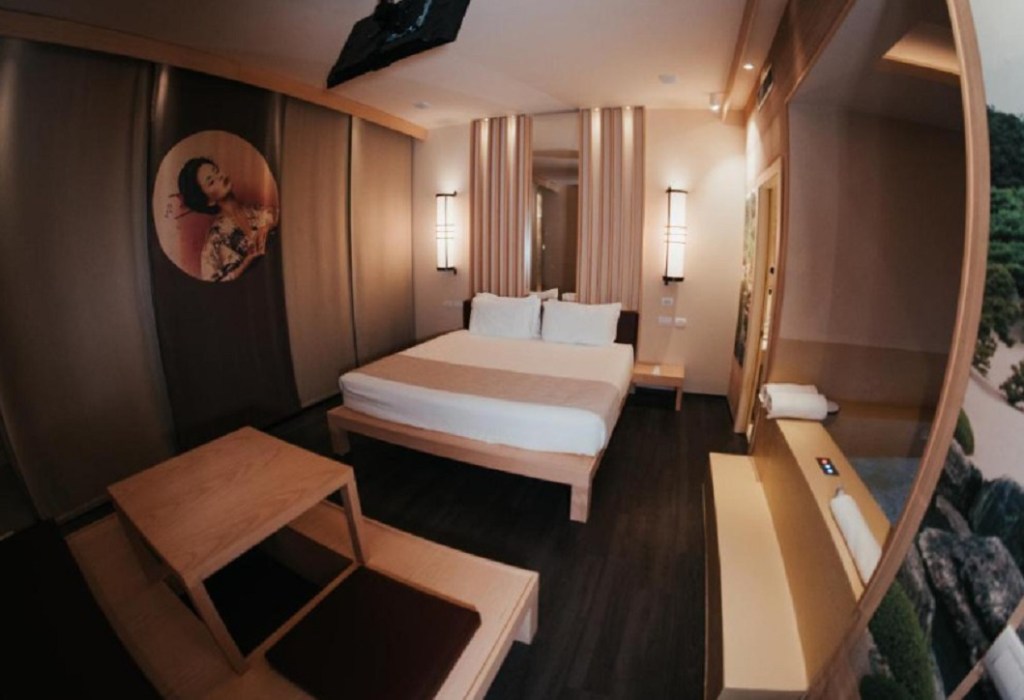 Il letto king-size, vestito con lenzuola morbide e confortevoli, è posizionato per godere della vista ottimale sulla stanza e sulla vasca, mentre pareti decorate con elementi iconici giapponesi contribuiscono a creare un’atmosfera autentica.