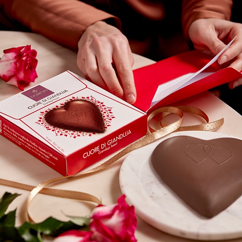 Il Cuore di Gianduja interpreta con delicatezza l’idea di dono senza tempo: una consistenza morbida e avvolgente che racchiude tutto il gusto del gianduja Domori, presentata in una confezione ispirata a una busta da lettera, essenziale e contemporanea, arricchita dalla possibilità di inserire un messaggio personalizzato tramite QR code.