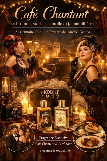 Ad arricchire ulteriormente l’esperienza, la prestigiosa maison Nobile 1942 accompagnerà la serata con un corner profumato esclusivo, dedicato alle fragranze artistiche Cafè Chantant e Perdizione: un viaggio olfattivo tra ciprie, fiori, velluti e seduzioni notturne. Un’occasione rara per scoprire il profumo come racconto, incontrare i creatori delle fragranze e lasciarsi guidare tra note evocative che parlano di teatri fumosi, amori segreti e palcoscenici illuminati.