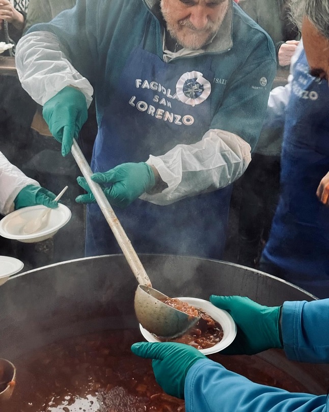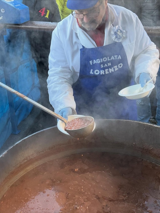 La fagiolata di San Lorenzo nasce nel 1967 dai Coscritti e si inserisce nei festeggiamenti invernali del quartiere. Il suo momento più poetico avviene il 6 gennaio, giorno dell’Epifania: davanti alla chiesa, durante il giro di “sveglia”, Pifferi e Tamburi ricevono una ciotola di fagioli fumanti per “scaldarsi le mani”. È un gesto semplice, nato spontaneamente, che anticipa la festa e che negli anni è diventato tradizione. La degustazione del sabato di Carnevale e la distribuzione della domenica completano un percorso che unisce memoria, musica e comunità.