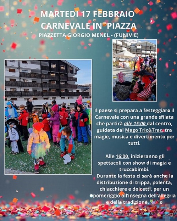 Martedì 17 febbraio il centro del paese si anima con la sfilata guidata dal mago Tric&Trac (ore 15.00) che accompagna grandi e piccoli con musica, maschere e allegria. Il pomeriggio prosegue in Piazzetta Giorgio Menel – Funivie (ore 16.00) con uno spettacolo magico, truccabimbi e animazione per famiglie, mentre il profumo della polenta, delle chiacchiere e dei dolcetti riempie l’aria, trasformando la festa in un momento di gioiosa condivisione.