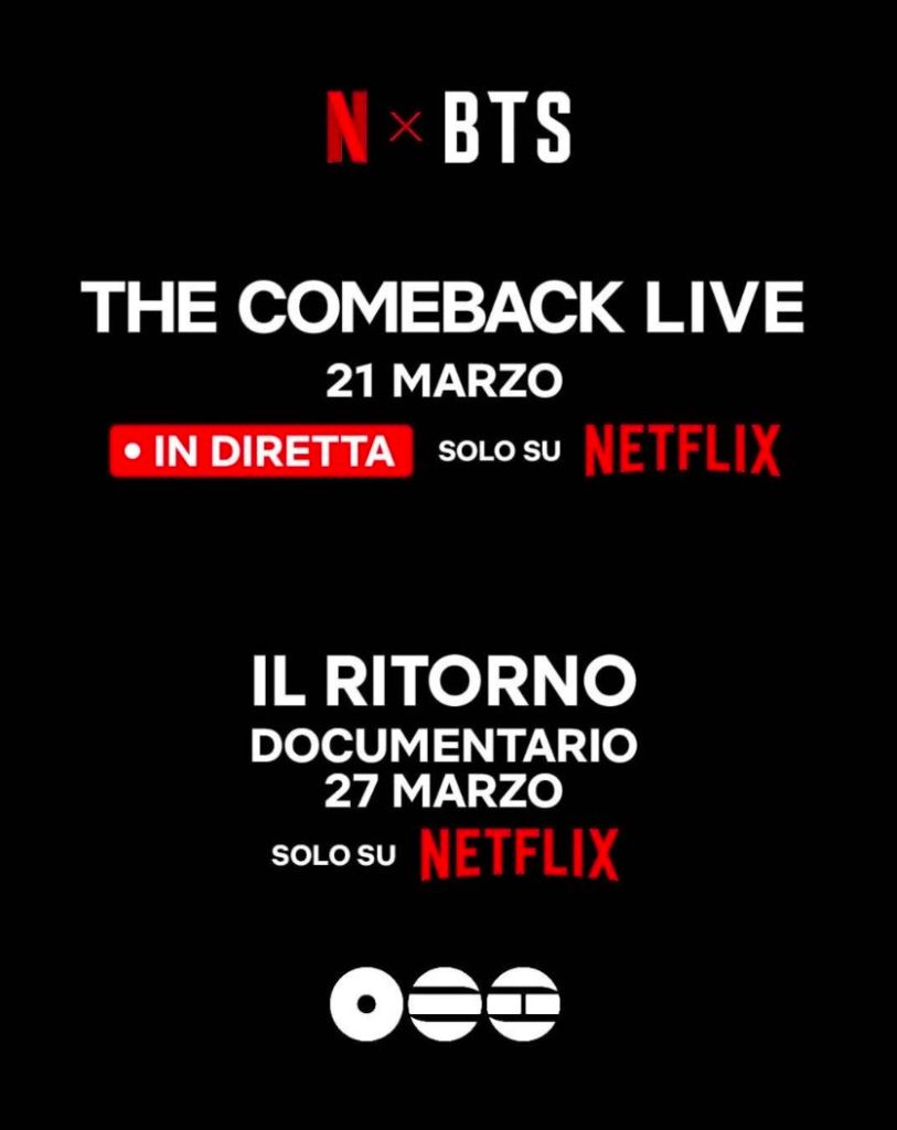 “BTS THE COMEBACK LIVE | ARIRANG” in diretta da Seul (Corea del Sud) su Netflix il 21 marzo alle 12.00 (ora italiana) e “BTS: IL RITORNO” il documentario esclusivo che racconta il ritorno dei BTS, firmato dal pluripremiato regista Bao Nguyen, sempre su Netflix dal 27 marzo 2026.