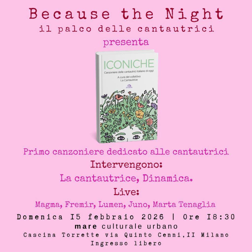 “Because The Night- Il Palco delle Cantautrici” ospita domenica 15 febbraio, ore 18.30, in occasione del quarto appuntamento della settima stagione al mare culturale urbano ((Cascina Torrette, Via Quinto Cenni, 11, Milano), il collettivo La Cantautrice, che presenta “Iconiche- Canzoniere delle cantautrici italiane di oggi”, pubblicato lo scorso novembre per Arcana Edizioni.