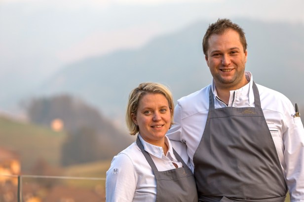 I 13 tavoli del ristorante sono strategicamente posizionati davanti alle scenografiche vetrate, per offrire a tutti gli ospiti una vista unica sulla vallata mentre la splendida cucina a vista permette di ammirare in modo privilegiato il processo creativo che ci cela dietro ogni piatto.