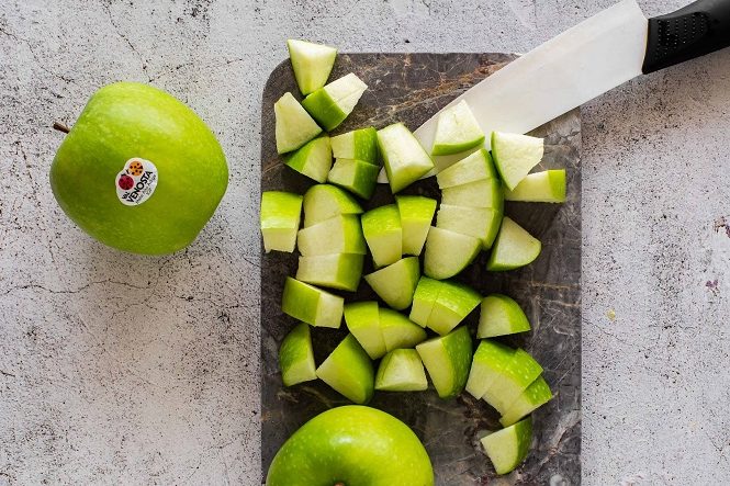Per preparare lo smoothie verde con mele Granny Smith lavate bene le mele, eliminate il torsolo, tagliatele a pezzetti e mettete nel frullatore.