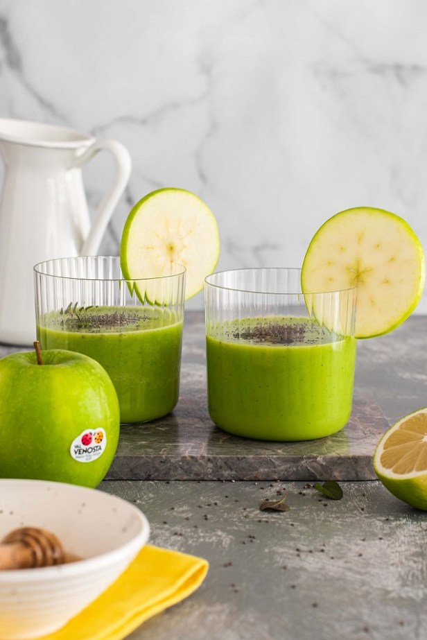 Uno smoothie dal cuore green e ricco di benefici. Il cuore di questa golosa ricetta a cura di Julia Morat – PassioneCooking è la Mela Granny Smith Val Venosta, dall’inconfondibile nota acidula, resa ancora più marcata dalla spremuta di arancia e limone. Il profilo aromatico complessivo viene poi bilanciato dalla dolcezza del miele, per un inizio di giornata con il sorriso e ricco di benefici!