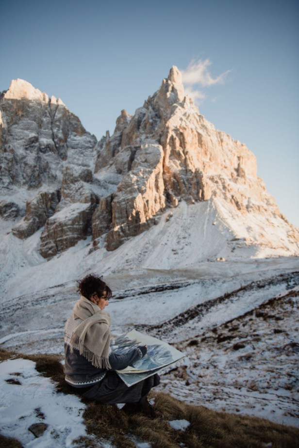 Silvia De Bastiani (Feltre, 1981), vive e lavora nella valle del Primiero, tra le Dolomiti trentine. È tra le più raffinate interpreti del paesaggio alpino contemporaneo, realizza acquarelli monumentali dipinti en plein air, spesso in condizioni estreme, che offrono allo spettatore un’esperienza avvolgente e multisensoriale: la pittura diventa un luogo dove si depositano luce, temperatura, silenzio, odori e vibrazioni raccolti nelle lunghe ore trascorse in montagna. È anche un viaggio interiore dell’artista che, attraverso il lento lavoro delle velature, svela e dispiega mondi emotivi, invitando lo spettatore a lasciarsi attraversare da quelle sensazioni e riflessioni che accompagnano la sua vita creativa, le stesse che, in modi diversi, appartengono a ogni essere umano nel proprio attraversare l’esistenza. Il virtuosismo tecnico è l’elemento che sorprende e conquista ed è uno dei tratti distintivi dell’artista feltrina. La sua capacità di dominare l’acquerello su grandi formati e all’aperto le consente di raggiungere una profondità espressiva che richiama i grandi Maestri del passato, ma la sua pittura non è solo abilità: è interpretazione, ascolto, rielaborazione, una sintesi che permette anche al visitatore meno esperto di cogliere l’essenza del paesaggio alpino. Nelle sue opere, la montagna non è solo soggetto, ma linguaggio identitario. Le Dolomiti, le cime venete e trentine, ma anche le Alpi lombarde, piemontesi, valdostane e svizzere diventano materia viva, colta con un approccio quasi scientifico alla morfologia, alla geologia, alla vegetazione e ai mutamenti atmosferici. Una pittura che unisce rigore e poesia, precisione e contemplazione.