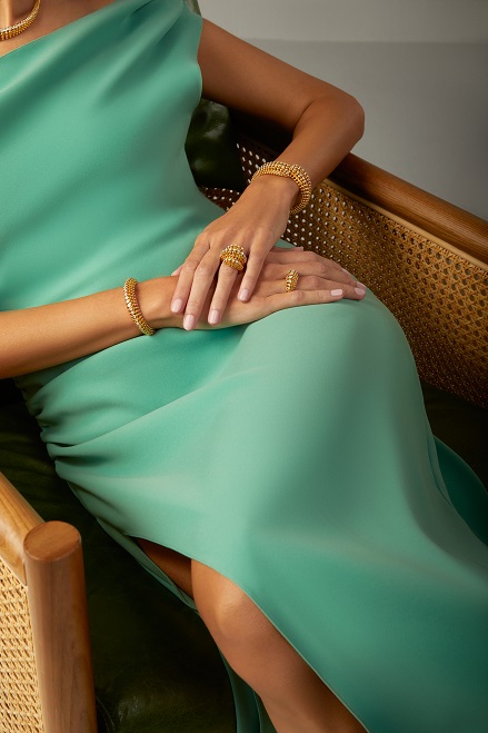 gli orecchini oscillano come bolle d’aria, gli anelli si torcono in un gioco sinuoso, i bracciali tintinnano lievi — come una melodia al mattino.