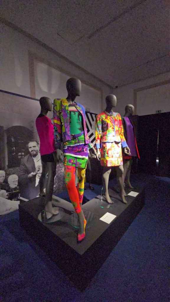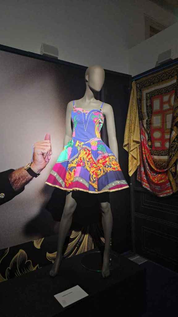Le tre sale dedicate alla mostra ti accolgono con un video-racconto di alcuni momenti salienti della vita dello stilista, famoso per il suo fascino e per i suoi modi accattivanti. In una scena in particolare, giocando tra il serio ed il faceto, guarda la telecamera e con fare scanzonato dichiara al mondo: “Io sono Gianni Versace!”.