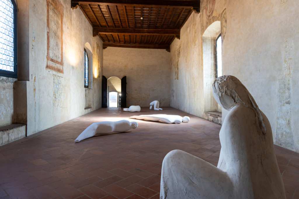 Dagli abissi si risale verso un grande salone luminoso abitato da candidi corpi distesi, essenziali e primigeni: tra essi emerge Adamo, colto nell’istante successivo alla caduta. Nella Sala del Vicario si impone la figura della Bona Dea, affiancata da dipinti ispirati all’Antico Testamento, mentre conclude il percorso un grande angelo in gesso, presenza austera che riapre la riflessione sulla scultura come frammento narrativo e possibilità di nuovo inizio.