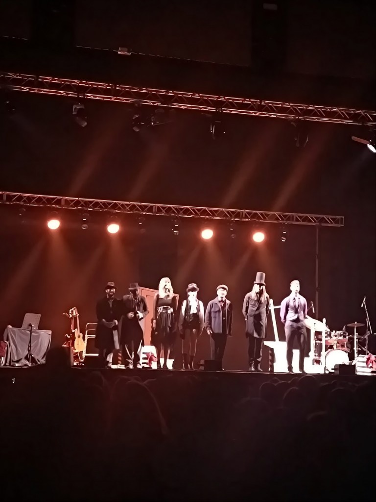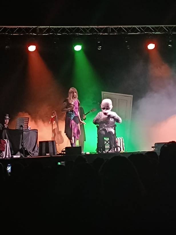 Lo spettacolo ha aperto le porte al suo pubblico con un’atmosfera soffusa e misteriosa. “Con questa mano io dissiperò i tuoi affanni. Il tuo calice non sarà mai vuoto perché io sarò il tuo vino. Con questa candela illuminerò il tuo cammino nelle tenebre. Con quest’anello io ti chiedo di essere mia.” Questo il monologo del film “La sposa Cadavere” che dà il benvenuto agli spettatori. Per poi lasciarli divertiti dinanzi alla canzone “Il Jazz dell’adilà”, dove i tre artisti della Spleen Orchestra hanno deliziato il pubblico con le loro voci forti e calzanti. A chiudere l’emozionante blocco dedicato alla Sposa Cadavere, è stata la malinconica canzone “Se toccassi una candela” dove la dolce Emily fa seriamente i conti con il suo essere ormai trapassata. Gli iconici capelli blu e il vestito da sposa sgualcito, insieme alla strabiliante vocalità della cantante, hanno regalato alla platea una caterva di emozioni.