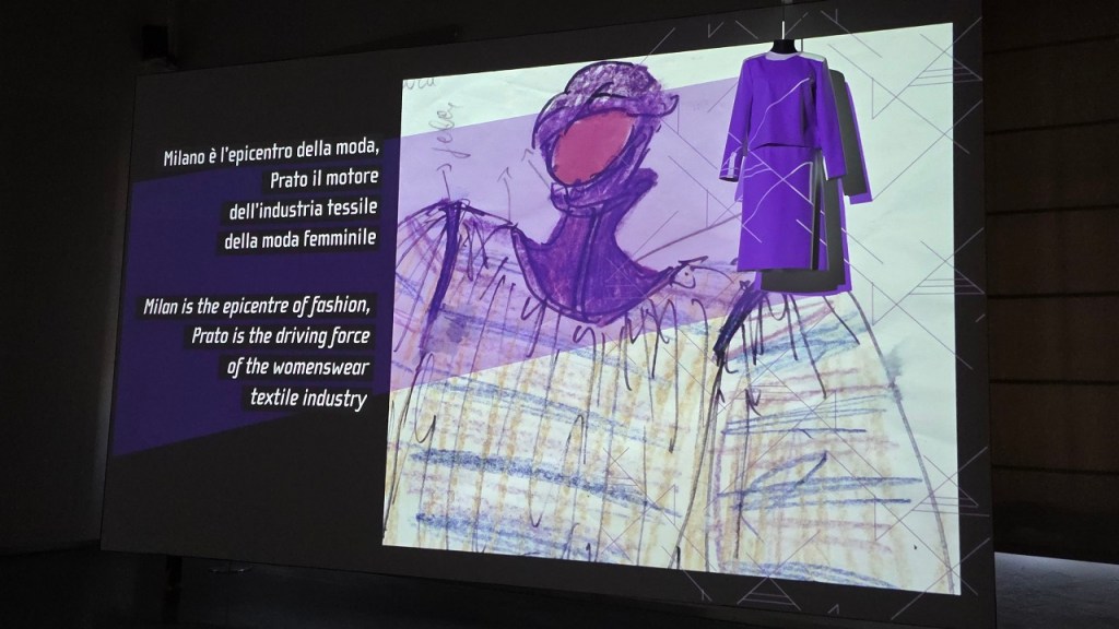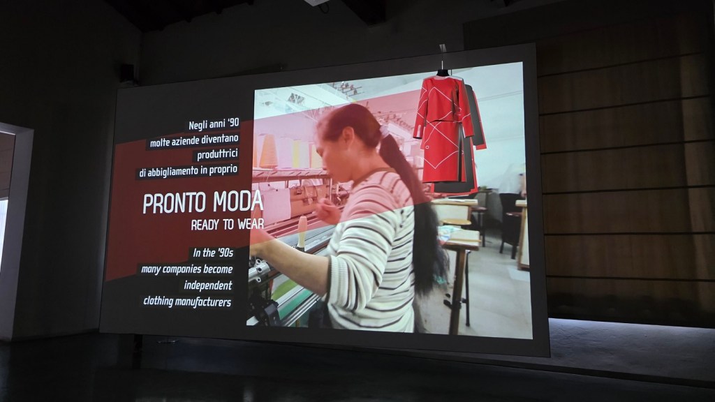 Un video interattivo, posto strategicamente all’ingresso, funge da bussola temporale e concettuale, riassumendo la storia sartoriale di Prato attraverso una simbologia evocativa e potente.