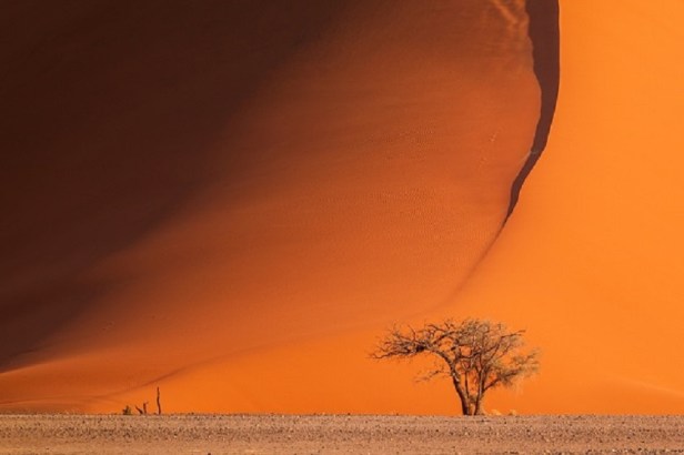 Come apparirebbe un deserto se a immaginarlo fosse stato De Chirico o Carrà? Più o meno come il parco di Sossusvlei, nel deserto del Namib: l’ombra lunga dell’alba che sorge dietro colline color albicocca e affonda in profondità in un manto omogeneo di sabbia bianca, interrotto soltanto dagli scheletri anneriti di alberi d’acacia che creano un contrasto estremamente essenziale. Sono spazi di contemplazione: lo scenario surreale della Valle della Luna, confini invisibili da attraversare come il Tropico del Capricorno e confini naturali molto più evidenti come il Kuiseb Canyon, il cui corso a tratti verdeggiante divide nettamente le pianure rocciose dalle dune rosse del deserto.