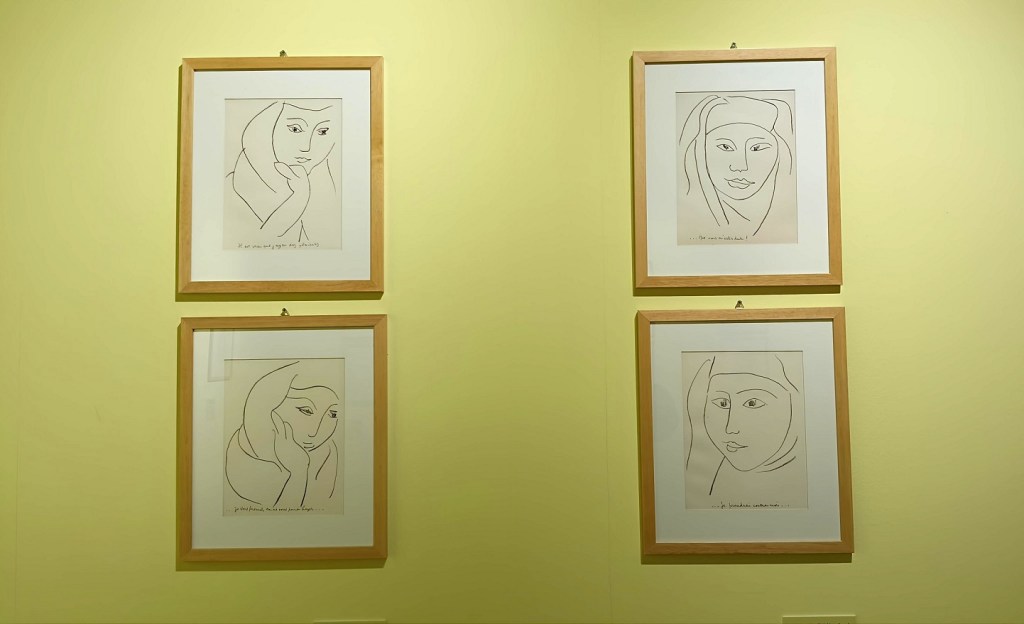 Libri d’artista e libri illustrati è il titolo della seconda sezione espositiva, in cui il disegno dialoga con la letteratura. La sezione è composta da 24 disegni su carta velina in tiratura unica limitata (Tériade ed., 1963) realizzati da Matisse per il saggio poetico Une fête en Cimmérie di Georges Duthuit, e per il romanzo epistolare Lettres Portugaises. Qui Matisse esplora il volto umano. Con una linea continua, riesce a evocare volumi e stati d’animo nei volti del popolo Inuit ritratti per il libro di Duthuit, senza mai staccare la penna dal foglio bianco, che da spazio vuoto diventa spazio integrante della composizione. Nelle Lettere Portoghesiil tratto si fa ancora più intimo e psicologico, riflettendo l’intensità emotiva delle celebri lettere d’amore e abbandono.