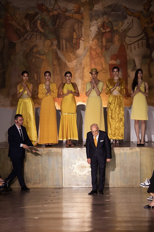 Michele Umberto Perrera è uno stilista di fama internazionale, attivo da sessant’anni nella moda maschile e femminile e quest’anno compie 88 anni. Ha partecipato al Festival della Moda di Sanremo nel 1968, è stato invitato all’Accademia dei Sartori di Roma nel 1971 e dal 1974 è presenza fissa alle sfilate annuali del Teatro Regio di Torino. Negli anni ’80 e ’90 ha condotto ricerche sartoriali innovative, raccolte nel celebre Trattato per le Sartorie, apprezzato nei salotti più influenti del settore. Nel 1970 si è classificato secondo al concorso “Forbici d’Oro”, vincendo il premio “Il Centimetro d’Oro”, e da allora contribuisce all’organizzazione dell’evento con la sua esperienza. Negli ultimi cinque anni ha partecipato a tutte le GX Fashion Week, consolidando la sua autorevolezza e influenza nel panorama sartoriale internazionale. In questa edizione, Perrera ha stupito ancora una volta, non limitandosi a presentare modelli perfettamente realizzati e rifiniti a mano, ma scegliendo il colore “tutto giallo” come filo conduttore della sua visione, trasformando la passerella in un’esplosione di luce, energia e gioia. Una scelta audace e poetica, che ha catturato lo sguardo e il cuore del pubblico, culminando in un’ovazione che ha celebrato non solo l’eccellenza sartoriale, ma anche la capacità di trasmettere emozione, personalità e vita attraverso ogni singolo capo.