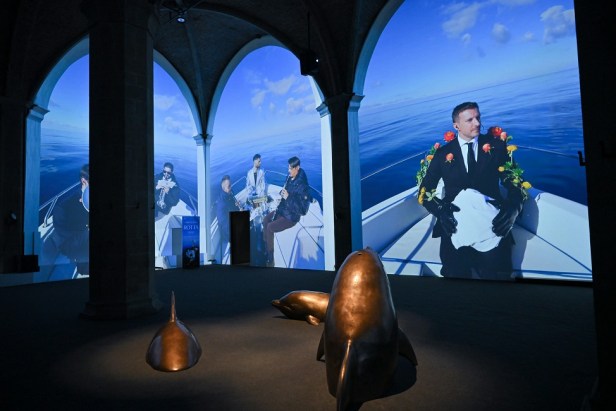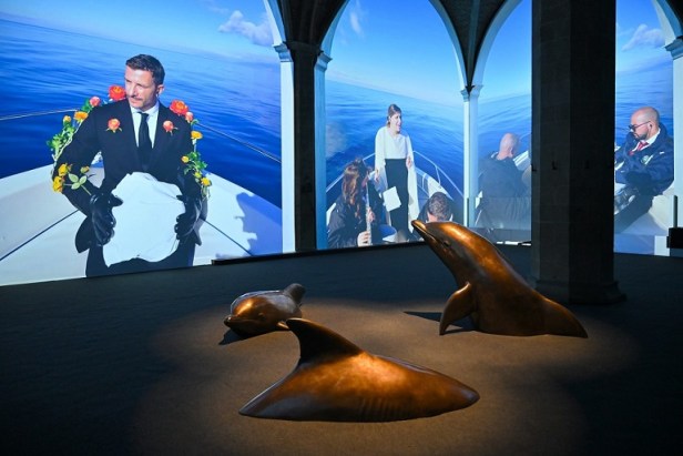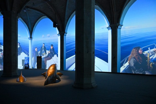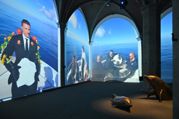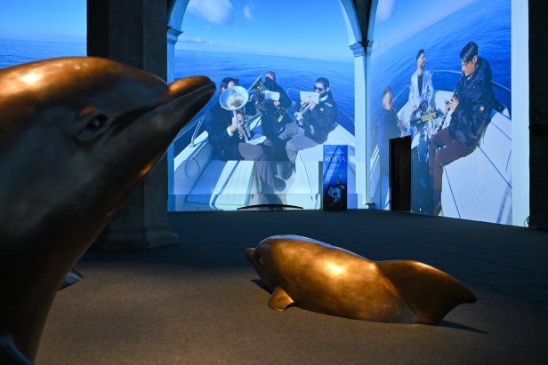 Nella Sala d’Arme l’installazione dialoga con elementi scultorei e sonori che amplificano la dimensione immersiva del progetto. Delfini in bronzo a grandezza naturale, ispirati alle apparizioni reali avvenute durante le riprese accanto alle imbarcazioni, diventano presenze simboliche di guida e orientamento. La pietra rinascimentale accoglie un paesaggio acustico che avvolge lo spettatore, trasformando l’architettura in cassa armonica contemporanea.