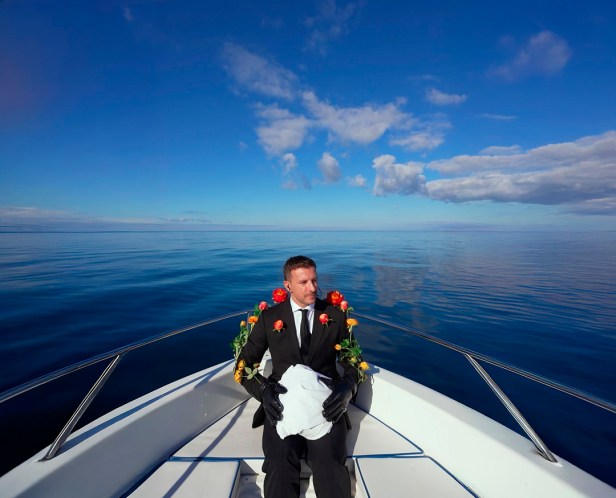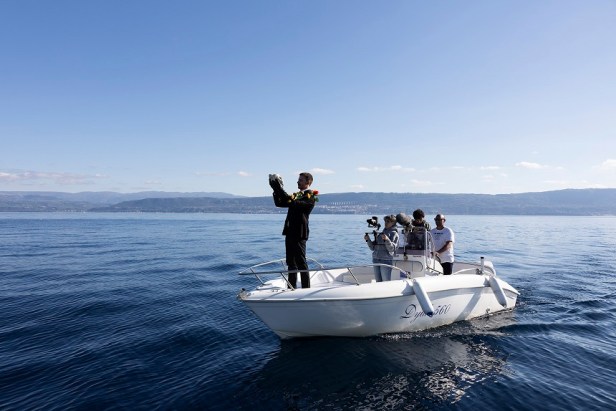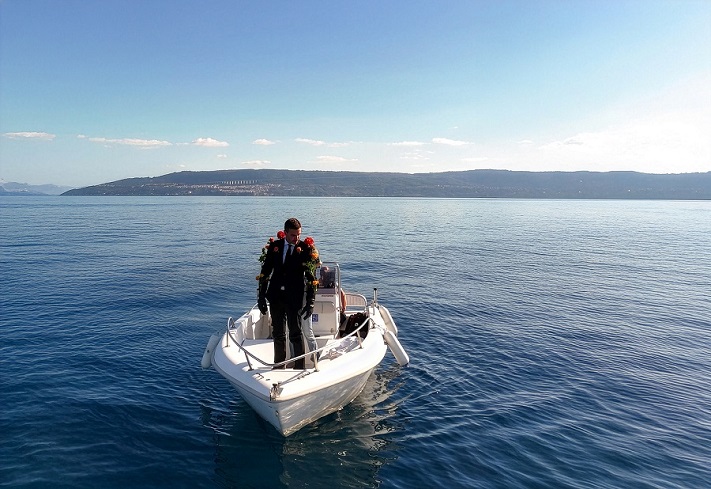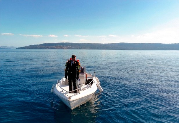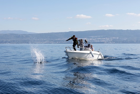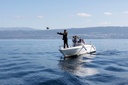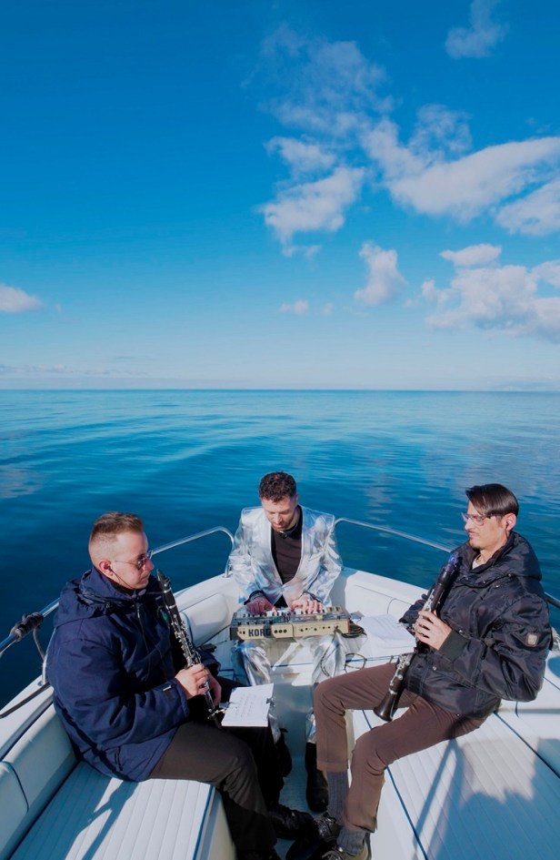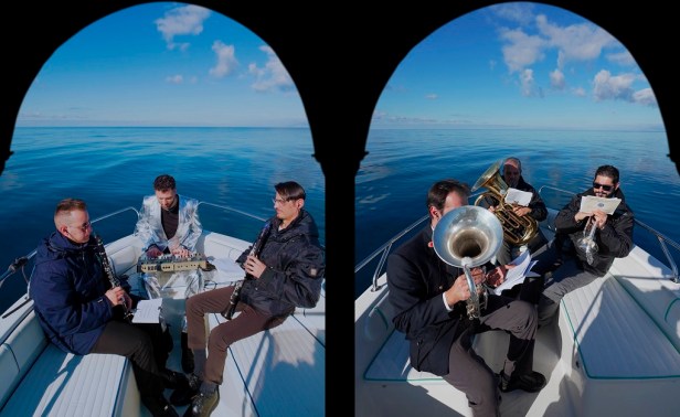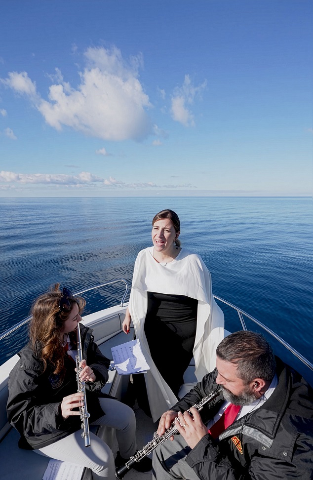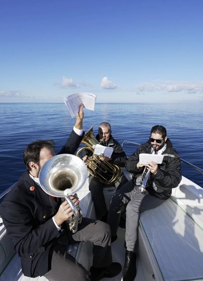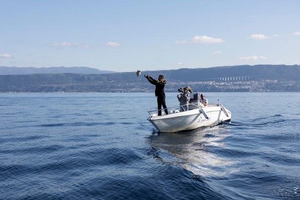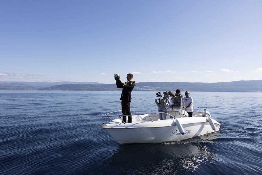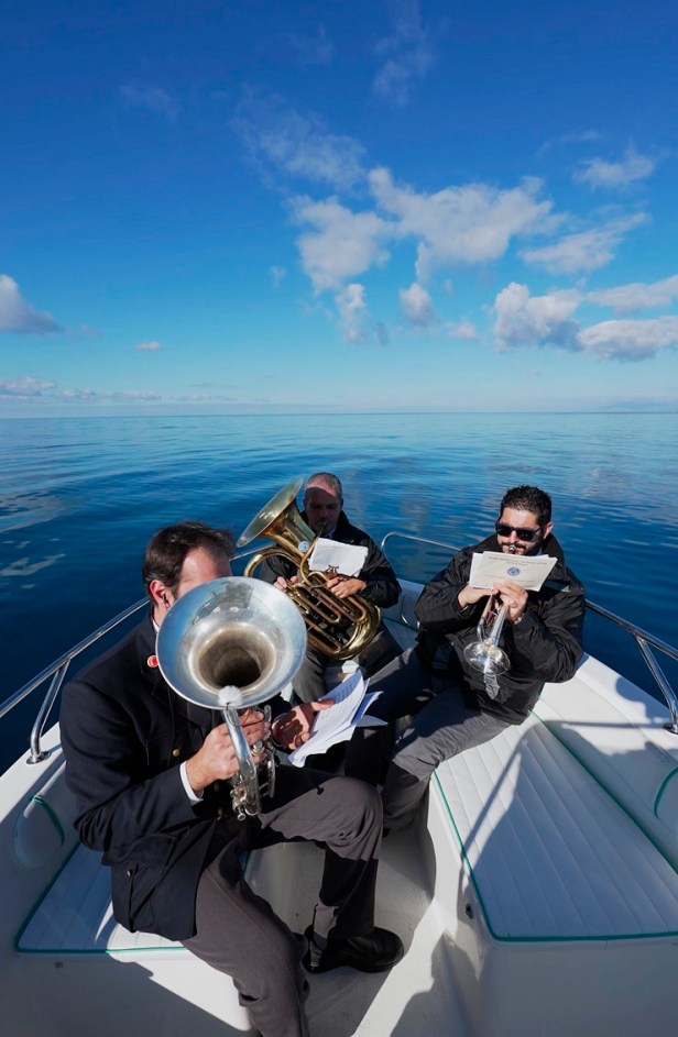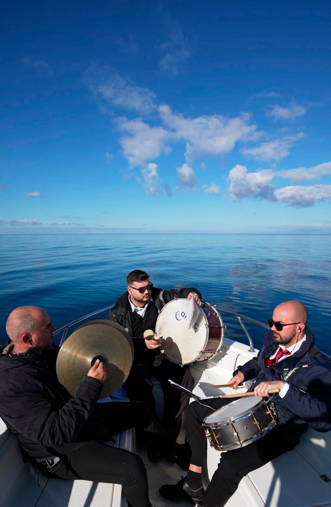 L’opera nata e creata dal visual artist e researcher Giuseppe Lo Schiavo è filmata in presa diretta con sette camere e registrata con trentadue microfoni. Il 10 dicembre 2025, a otto miglia dalla costa – distanza simbolica in cui si compie l’azione centrale – la Banda di Pizzo Calabro, diretta dal maestro Alessandro Maglia, ha eseguito in mare aperto due requiem e due brani contemporanei. Due di questi sono stati composti insieme all’artista da Marco Guazzone ed eseguiti sulle imbarcazioni accanto alla banda. La musica struttura l’azione e la trasforma in una cerimonia laica, un rito collettivo sospeso tra commemorazione e tensione.
