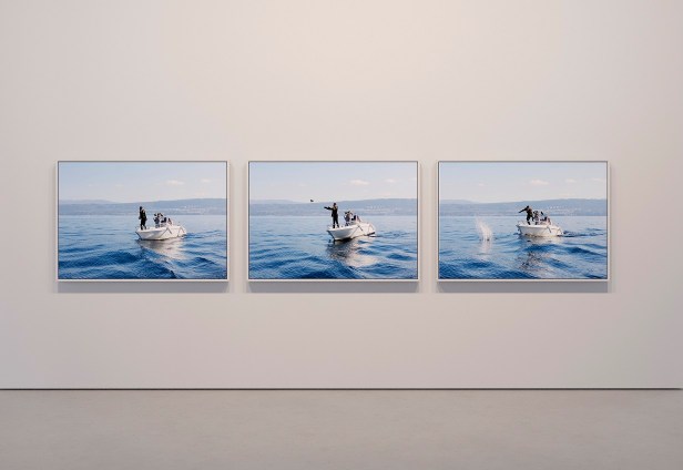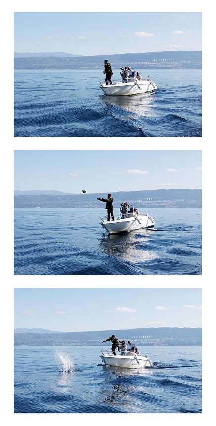 È al culmine del viaggio che l’opera compie il gesto più radicale. L’artista affida al mare una scultura antica. Un gesso liberato, consegnato deliberatamente alle onde, esposto allo sguardo pubblico nel momento stesso in cui viene sottratto alla tutela e alla permanenza. Il gesto assume la forma di un sacrificio e segna una frattura: la partitura si incrina, il suono si fa elettronico, teso, dissonante. L’armonia si interrompe. L’opera si chiude con una breve composizione musicale di Rakans, produttore musicale oggi in Germania, scritta a partire dalla propria esperienza di attraversamento del Mediterraneo in barca verso l’Europa, da rifugiato. Un’ultima traccia sonora che non è commento ma testimonianza, non accompagnamento ma memoria incarnata.