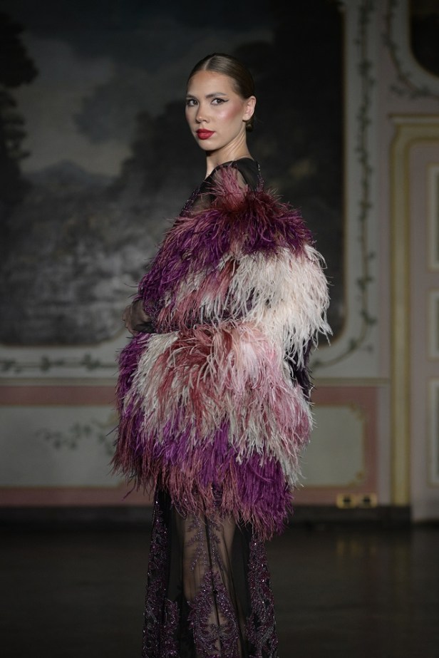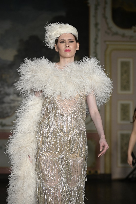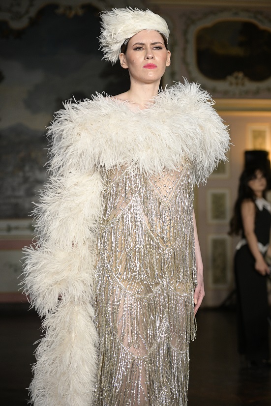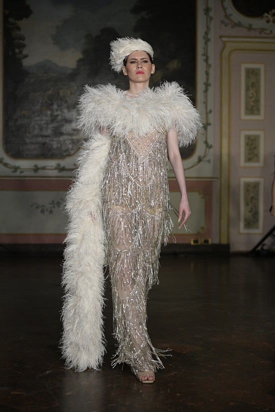 Completano i look dei particolari cerchietti realizzati con vari tipi di piume e voluminosi boleri, cappe e stole di piume.