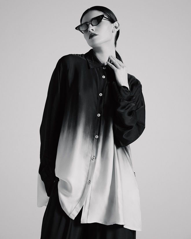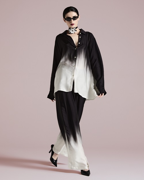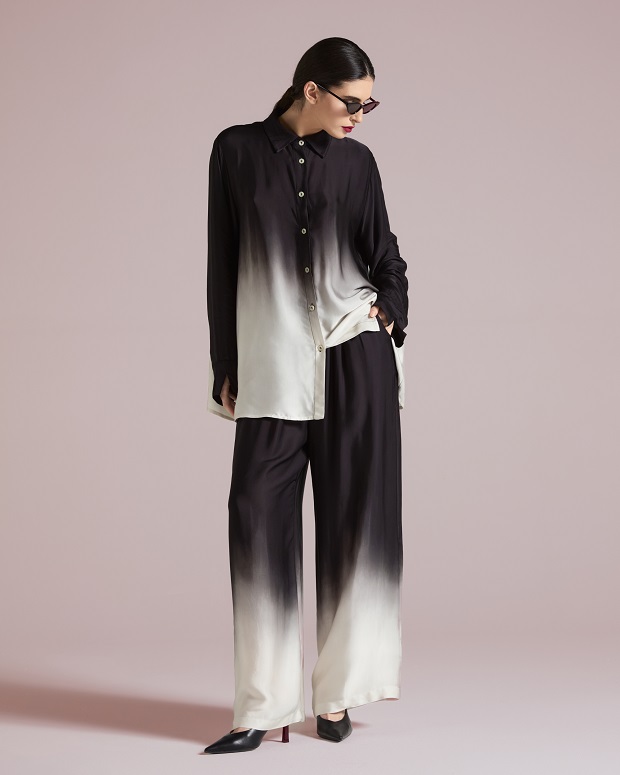 La capsule Marika interpreta questo spirito attraverso il raso di viscosa con stampa sfumata, una superficie viva che attraversa il colore come una linea in continua trasformazione, dallo scuro alla luce. Non è una stampa decorativa, ma un’atmosfera: morbida, dinamica, capace di cambiare intensità con la luce e con il ritmo di chi la indossa.