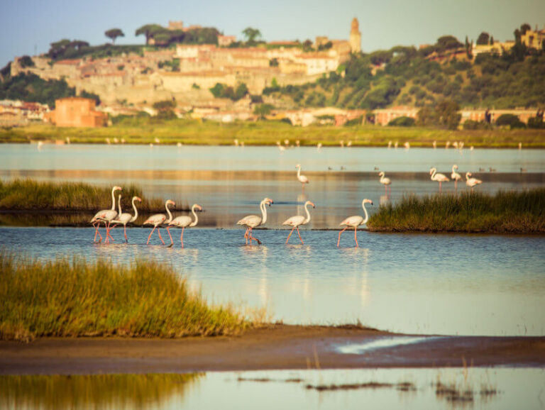 Verso la costa, la Riserva naturale Diaccia Botrona rappresenta ciò che resta dell’antico Lago Prile, un vasto bacino lagunare che in epoca etrusca e romana era navigabile. Oggi è una delle zone umide più importanti d’Italia: oltre al valore naturalistico, è un esempio straordinario di evoluzione sedimentaria, dove il lento deposito di materiali trasportati dai fiumi ha trasformato il paesaggio nei secoli. La Casa Rossa Ximenes, edificio simbolo della bonifica lorenese, ricorda l’ingegno umano nel dialogo con la natura.