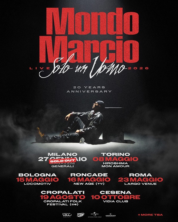 CALENDARIO DATE SOLO UN UOMO XX ANNIVERSARY Venerdì 8 maggio 2026 - TORINO - Hiroshima Mon Amour Venerdì 15 maggio 2026 - BOLOGNA - Locomotiv Sabato 16 maggio 2026 - RONCADE (TV) - New Age Sabato 23 maggio 2026 - ROMA - Largo Venue Mercoledì 19 agosto 2026 - CROPALATI (CS) - Cropalati Folk Festival Sabato 10 ottobre 2026 - CESENA (FC) - Vidia Club I biglietti saranno disponibili online su www.vivoconcerti.com da martedì 10 marzo 2026 alle ore 15:00 e in tutti i punti vendita autorizzati da domenica 15 marzo 2026 alle ore 10:00. Solo un Uomo XX Anniversary: https://mondomarcio.lnk.to/solounuomoxx L’organizzatore declina ogni responsabilità in caso di acquisto di biglietti fuori dai circuiti di biglietteria autorizzati non presenti nei nostri comunicati ufficiali.
