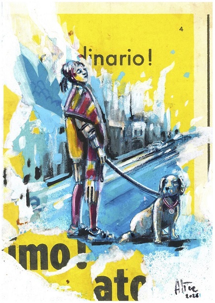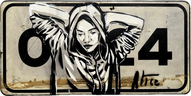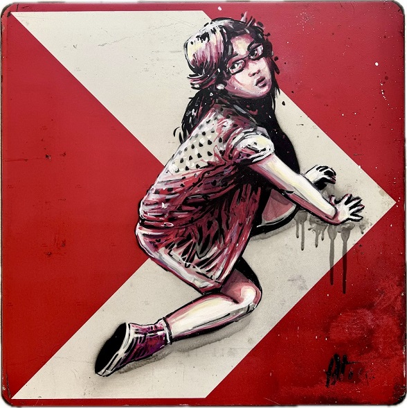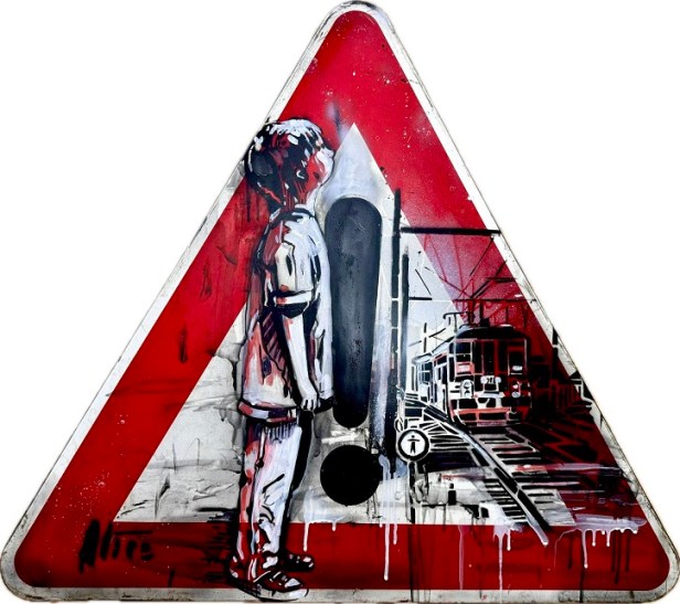 Il secondo ciclo è composto da segnali stradali dismessi, recuperati e dipinti, sottratti alla funzione originaria e trasformati in supporti pittorici. La loro forma, già codificata e riconoscibile, diventa campo narrativo in cui l’intervento non cancella il passato dell’oggetto ma lo integra, generando uno scarto tra il significato imposto e la nuova scena che vi si inscrive. Alice prende l’objet trouvé, lo riattiva e lo trasforma in nuovo dispositivo, in cui lo spazio pubblico conserva la propria memoria e insieme la supera. In entrambi i cicli il frammento non è resto ma origine e ogni singola unità (ritaglio, segnale, opera compiuta) contiene una storia possibile, l’archivio di una moltitudine, un catalogo in cui possiamo guardarci e riconoscerci come presenze sospese.»