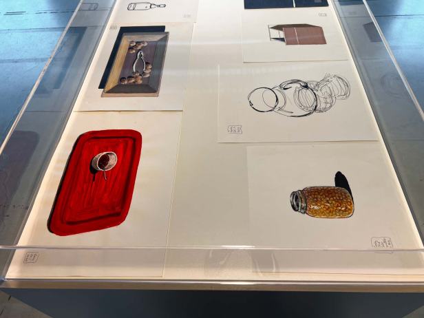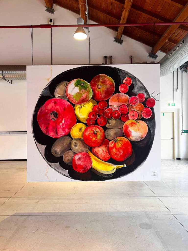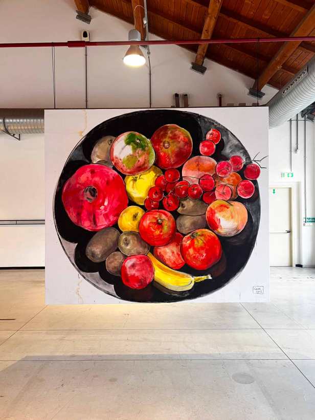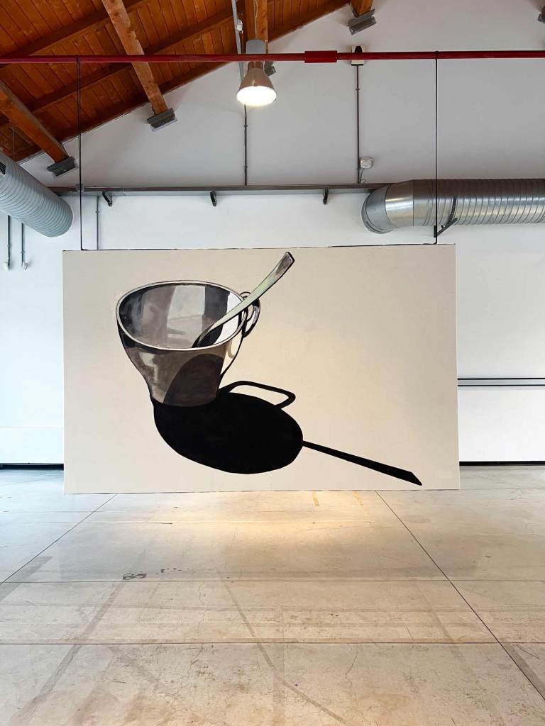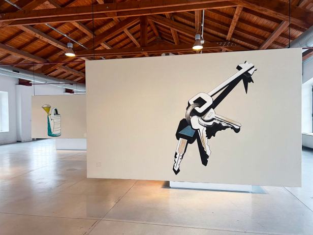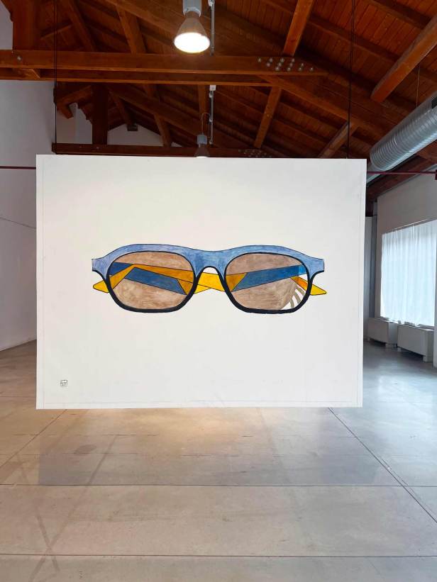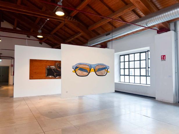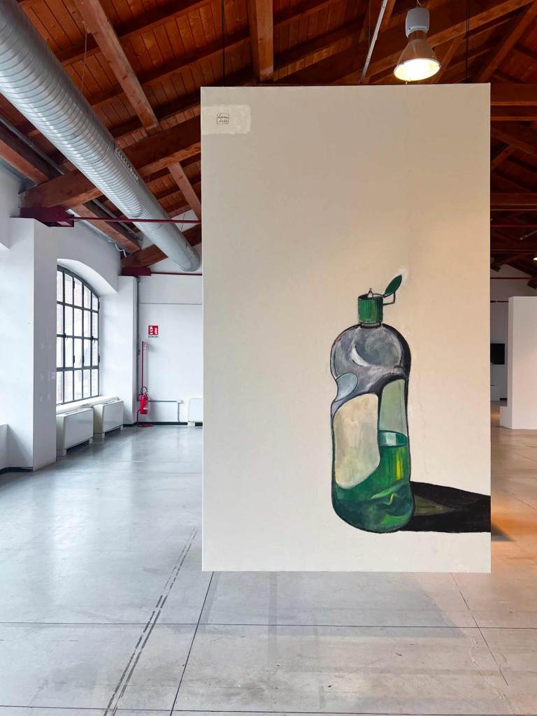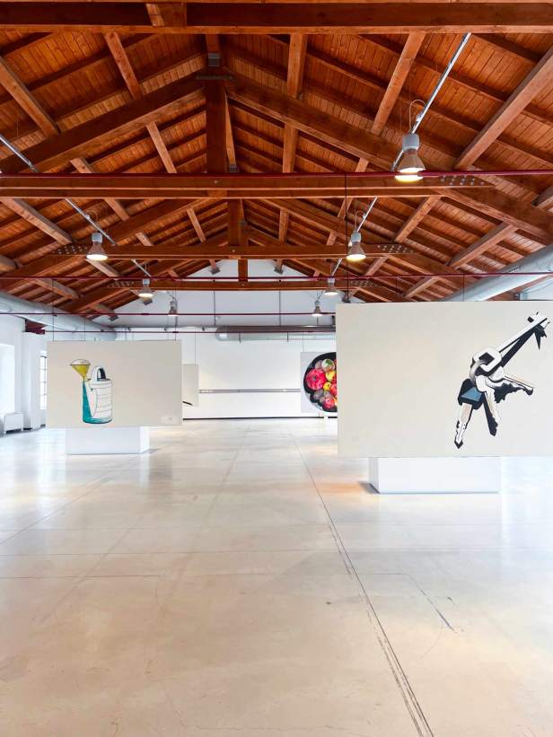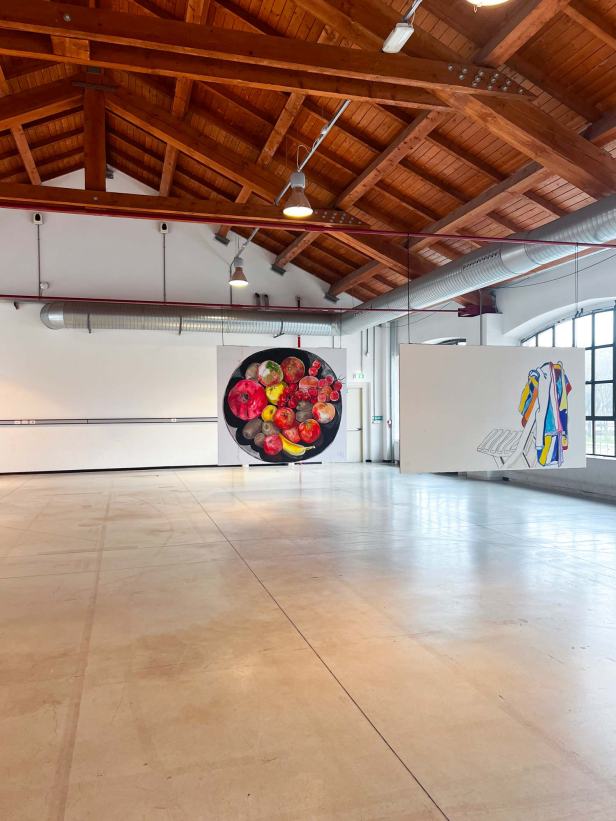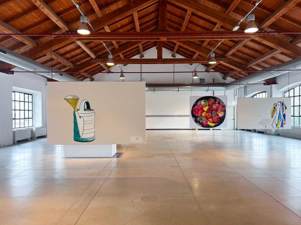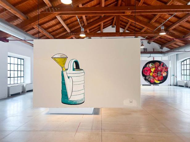 La mostra “MACRO POP” allestita alla Fabbrica del Vapore si compone in totale di quarantasei opere, otto tele monumentali, due dipinti di grandi dimensioni su legno e una serie di ritratti di piccolo formato su carta realizzati con tecniche diverse. Le opere più datate sono “Grande calamaio” del 1988 e “Televisore spento” del 1989 a dimostrazione di come il ritratto di oggetti sia una tematica costante nel lavoro di Luca. A queste si aggiungono “Frutta e pomodori” del 2012; “Accappatoi”, “Detersivo per i piatti”, “Mazzo di chiavi”, “Scodella e cucchiaio” del 2020; “Goccia” del 2021; “Annaffiatoio” del 2022 e il più recente “Occhiali da sole” del 2025.