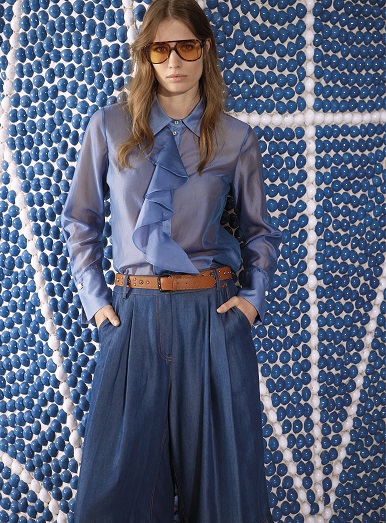 I colori iconici della struttura — il bianco luminoso, l’azzurro, il blu cobalto, le trasparenze — riecheggiano e valorizzano la palette della collezione SS26, creando un dialogo armonico tra superfici architettoniche e tessuti. Le linee fluide dei capi si confrontano con l’ordine geometrico degli spazi, dando vita a una moda che diventa architettura in movimento.