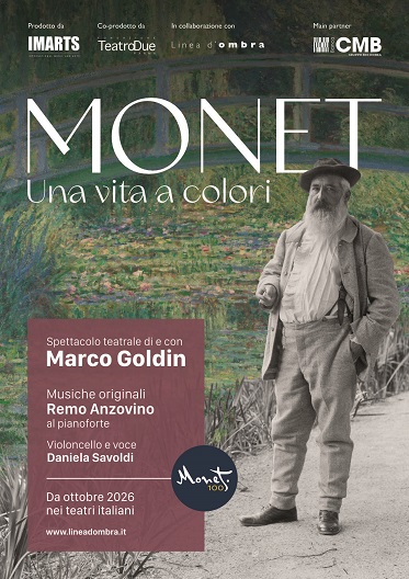 Dopo il successo ottenuto dalle due precedenti – nel 2018/2019 Storia dell’impressionismo e nel 2022/2023 Gli ultimi giorni di Van Gogh – prenderà il via nel prossimo mese di ottobre la nuova, attesissima tournée teatrale di Marco Goldin. Si tratta di uno spettacolo, scritto e diretto dallo stesso Goldin, intitolato Monet. Una vita a colori. Assieme a lui saliranno sul palcoscenico due musicisti d’eccezione: Remo Anzovino (autore delle musiche originali) al pianoforte e Daniela Savoldi, violoncello e voce.