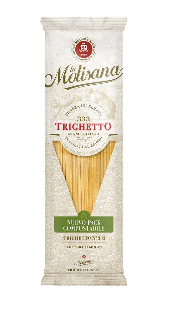 Grazie al nuovo nuovo packaging 100% compostabile, completamente privo di plastica e conferibile nell’organico, Trighetto La Molisana è anche green: il nuovo pack è realizzato in carta compostabile, è stato eliminato il film plastico all’interno della confezione ed è stata introdotta una finestra in cellulosa rigenerata, anch’essa compostabile e certificata FSC, che conserva la trasparenza e la visibilità del prodotto.