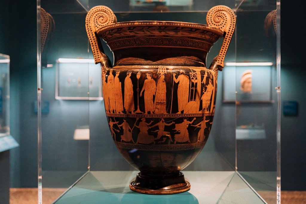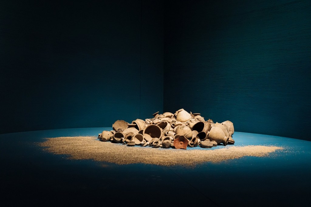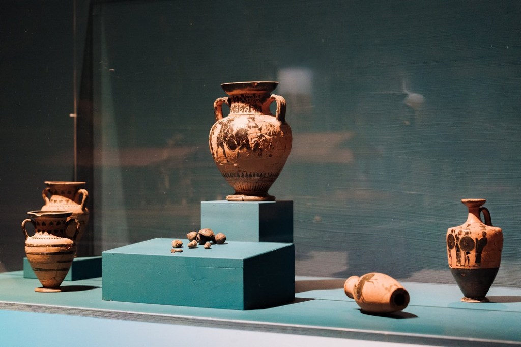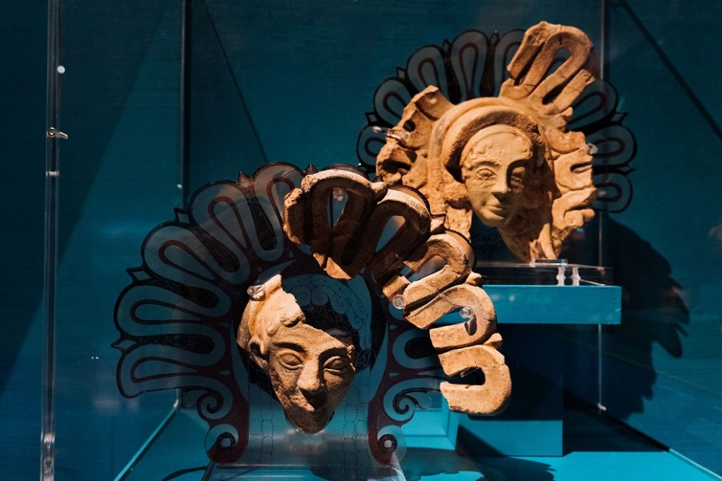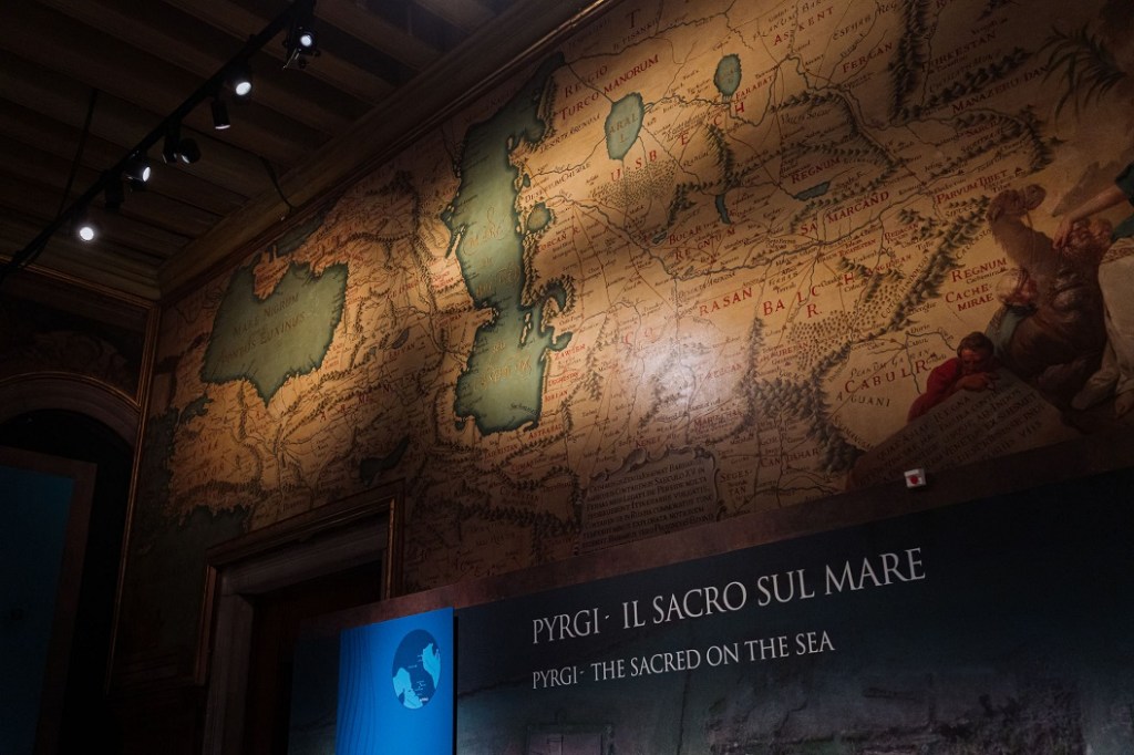 Il percorso si apre con Gli Etruschi e il sacro, introduzione al mondo religioso etrusco, segnata dalla presenza della Testa di Leucothea da Pyrgi, straordinario prestito del Museo Nazionale Etrusco di Villa Giulia: un’immagine potente e liminare, legata al mare e alla protezione dei naviganti, che introduce il tema dell’acqua come spazio sacro. Segue la sezione dedicata ai Sacri approdi dell’Etruria, con un focus, in due sale, su Vulci e Pyrgi. Di particolare rilievo è l’esposizione integrale del deposito votivo della Banditella, la più antica testimonianza nota in Etruria di un culto all’aperto legato a una sorgente. Il santuario portuale di Pyrgi è raccontato attraverso antefisse architettoniche e la copia delle celebri lamine d’oro, evocando il legame profondo tra culto, navigazione e potere politico.